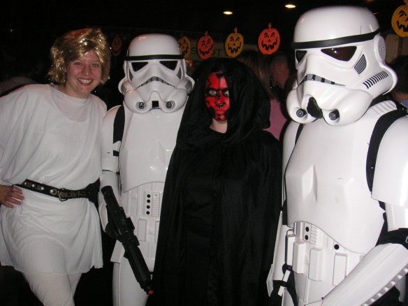 Anyhoo, I thought my outfit came out ok, considering what I had to work with, (which was a sheet, some bandages, some thermal underwear and an 80’s rocker wig!!). We got to the bar, and even found a couple of storm troopers wandering about (pictures attached). Unfortuntely, everyone we saw kept saying “Wow, great Darth Maul!! You look awesome!! and you’re supposed to be….. um…… an angel?”