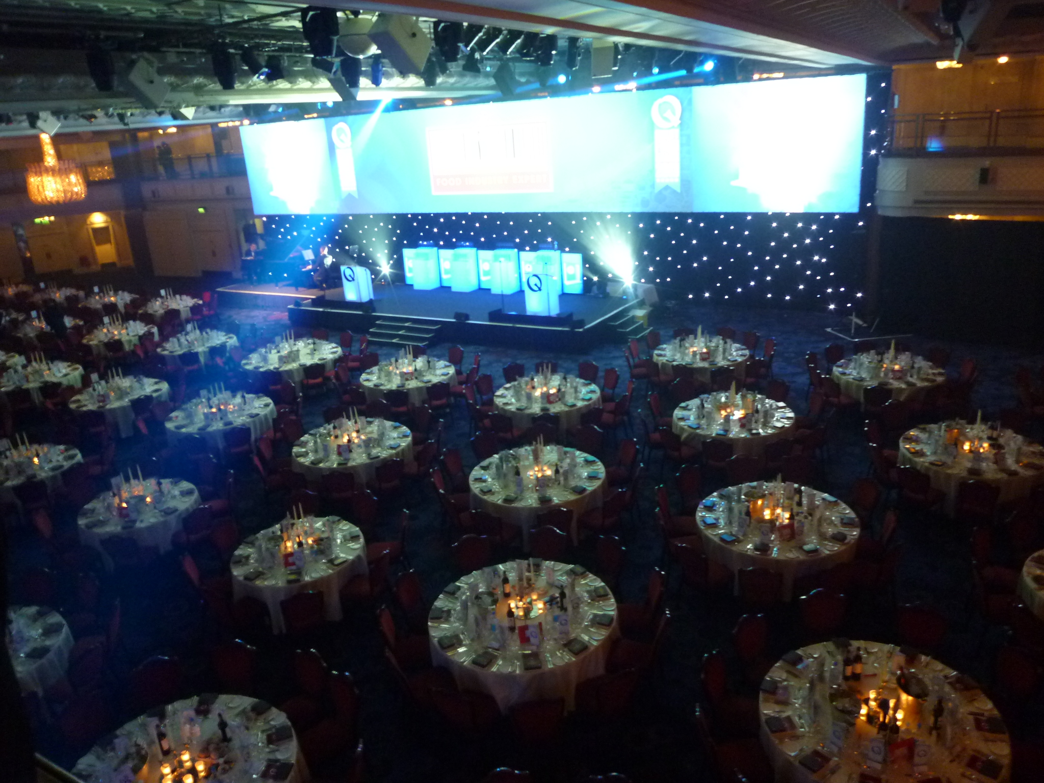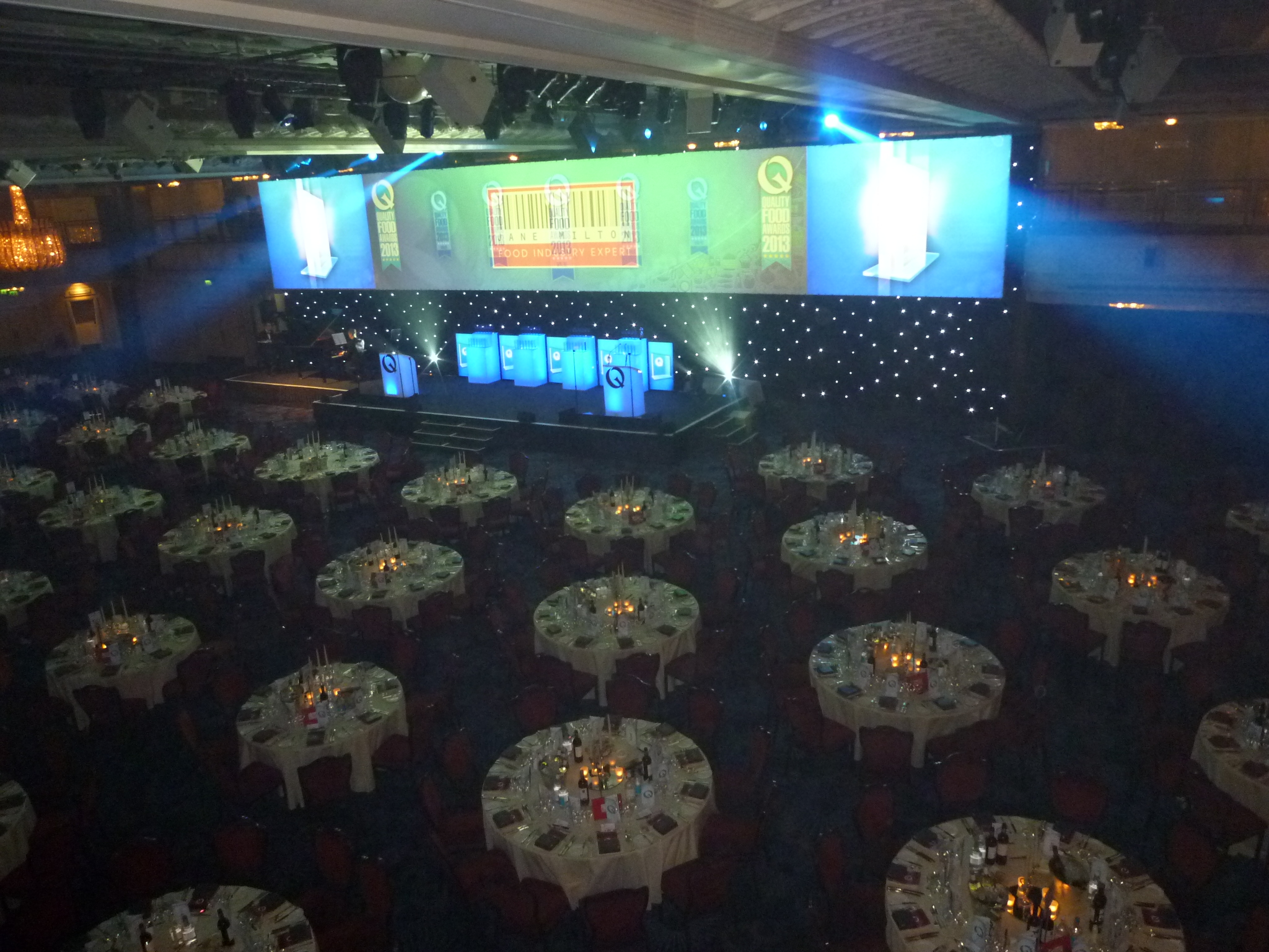 So we oooh and aaahh over the chandeliers, take some photos, and while Ivan was looking on the chart to see what table we were supposed to be on, C suddenly says “So what does the Q stand for?” I assumed it was a corporate sponsor of some sort, and then we looked at the banner behind the stage and simultaneously realised that it said in rather large letters “The Quality Food Awards”.