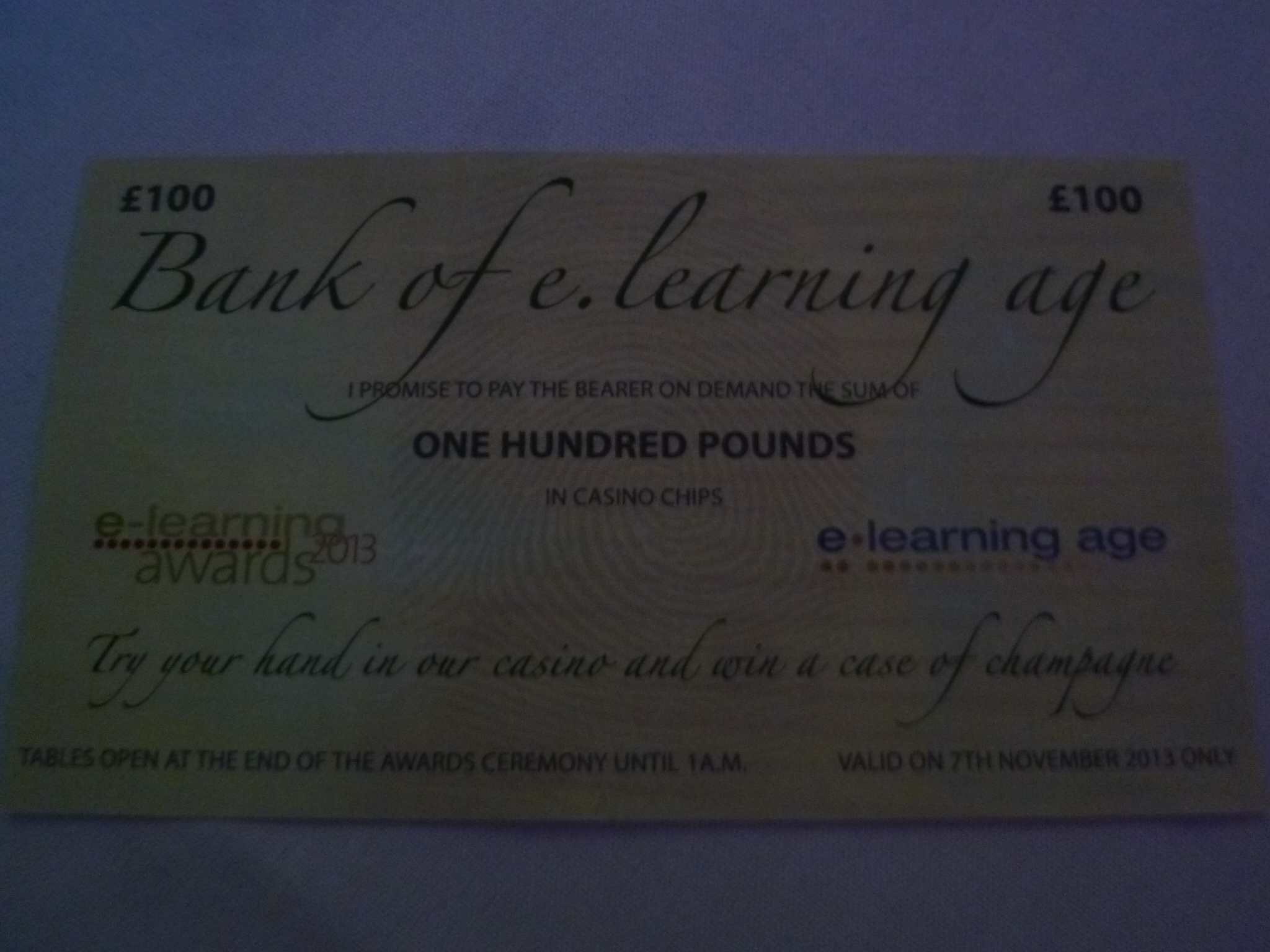 The food was lovely, and we got our free champagne, plenty of wine, and complimentary sponsored Toblerones (see photo) as well as a £100 of pretend e-learning money to spend in the casino.