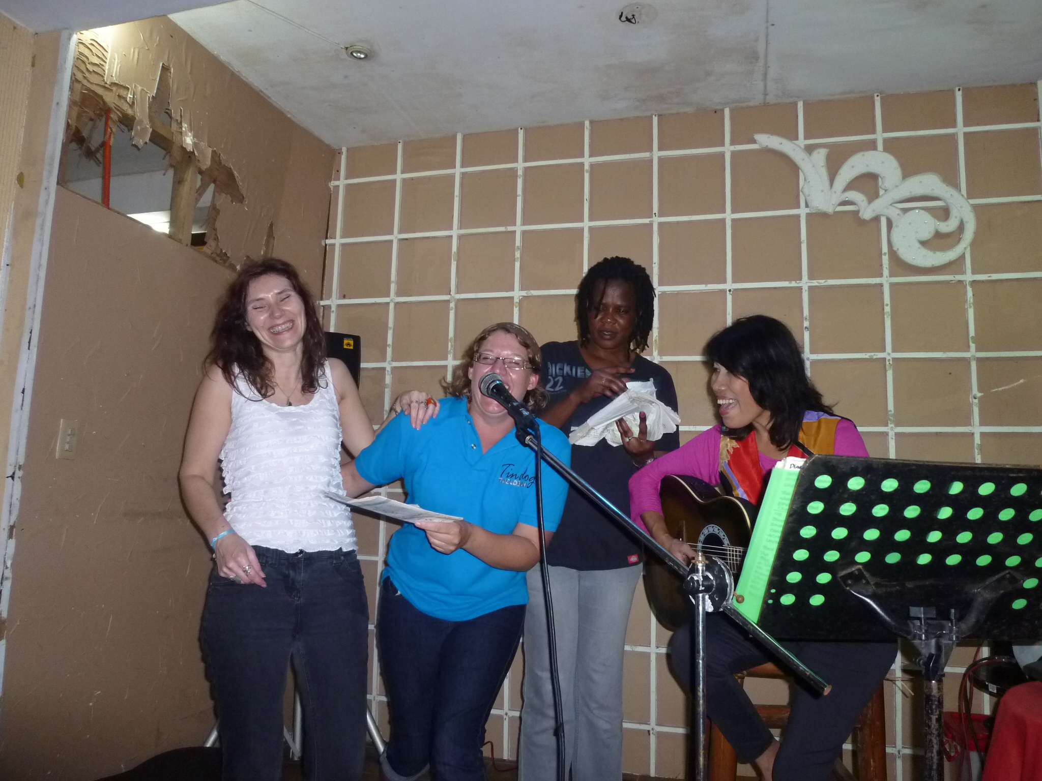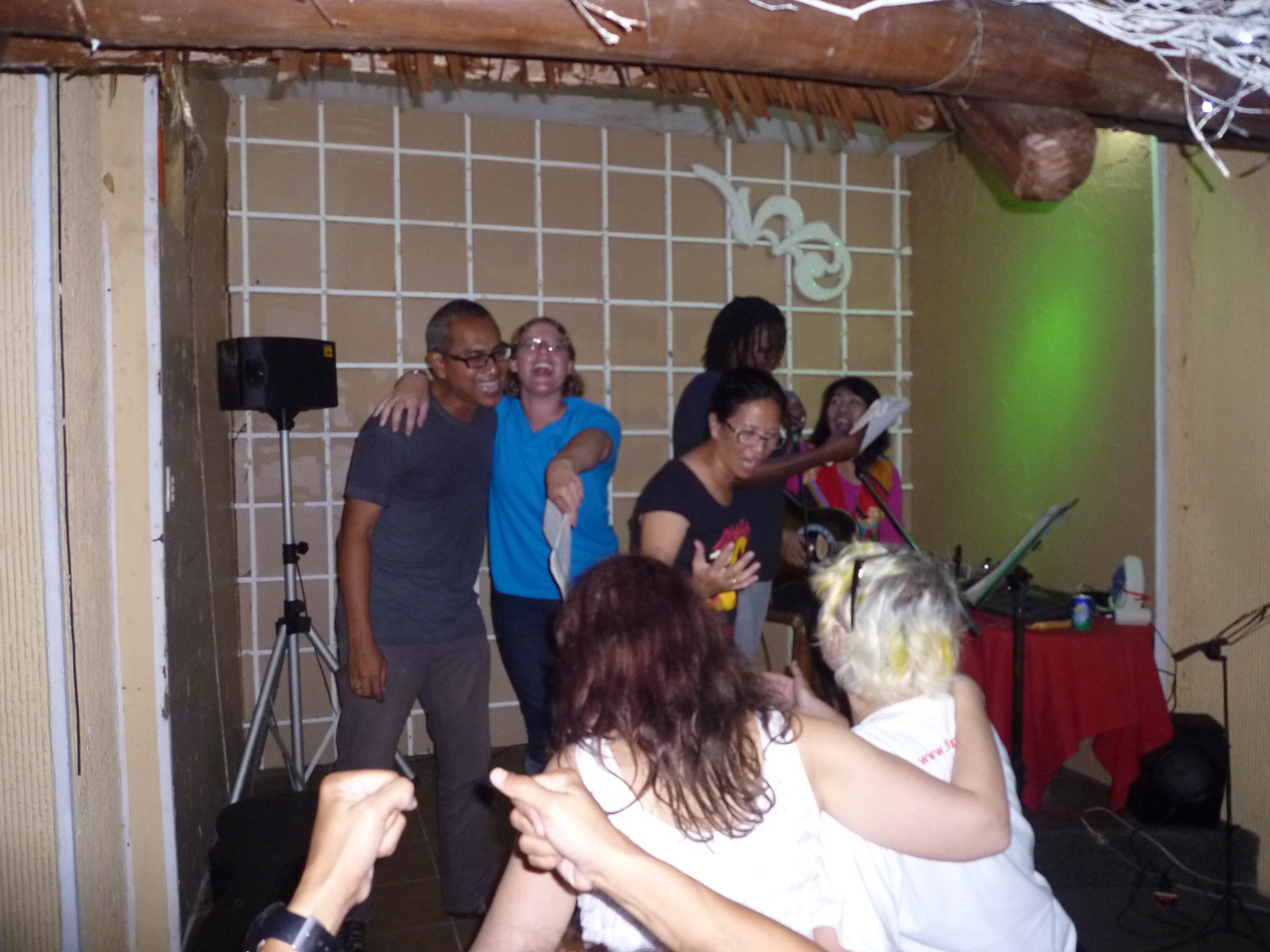Later that evening a smaller group of us headed upstairs to the restaurant for dinner and a few beers, as it was J’s leaving do as well. There was a lovely musician, Linda playing guitar and singing, and after a few beers we decided to turn the evening into a karaoke night, and took turns singing up on the stage.