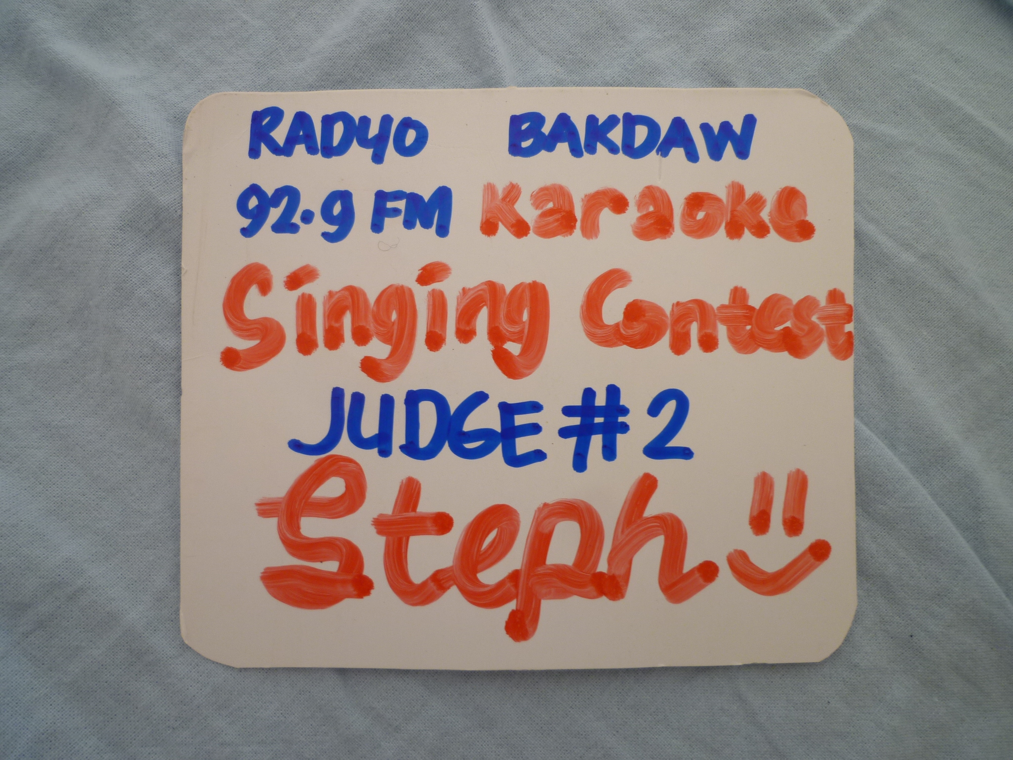 Have been chatting to a lot of guys from Internews, who run the community radio station here called Radyo Bakdaw. And this week I was asked to be a judge on their Friday afternoon karaoke competition – which is quite the honour! Every Friday 15 hopefuls come along to the radio station car park to try their luck, sing on the air, and win a radio, along with about 200 people who come along to watch and cheer them on.
