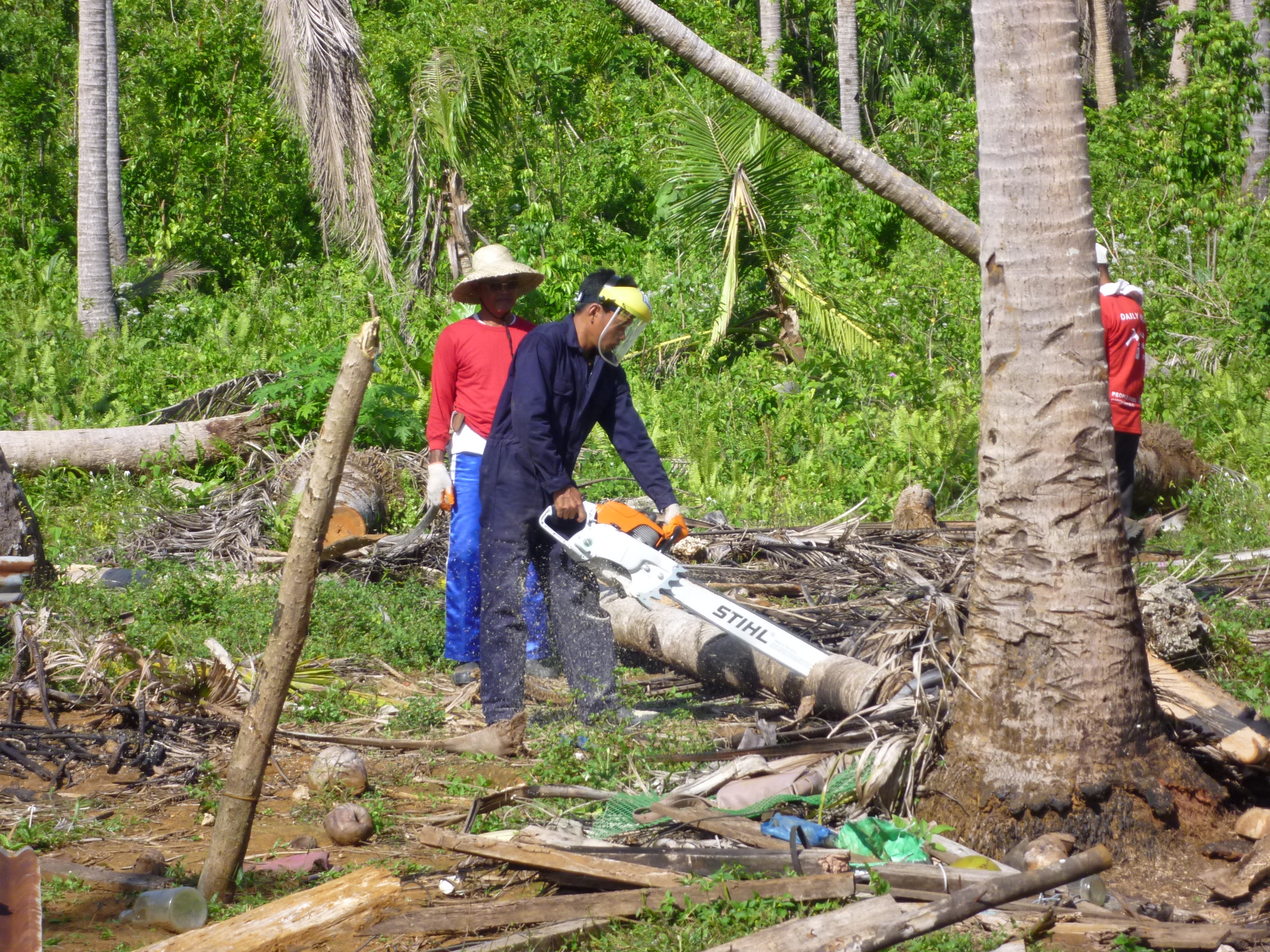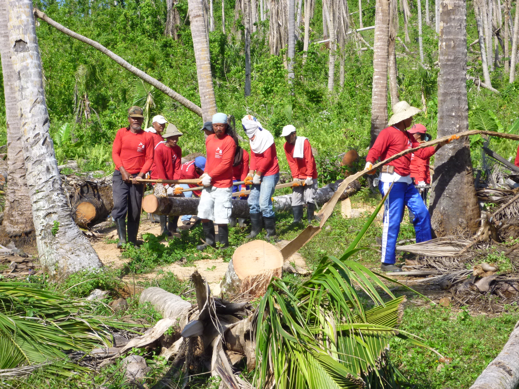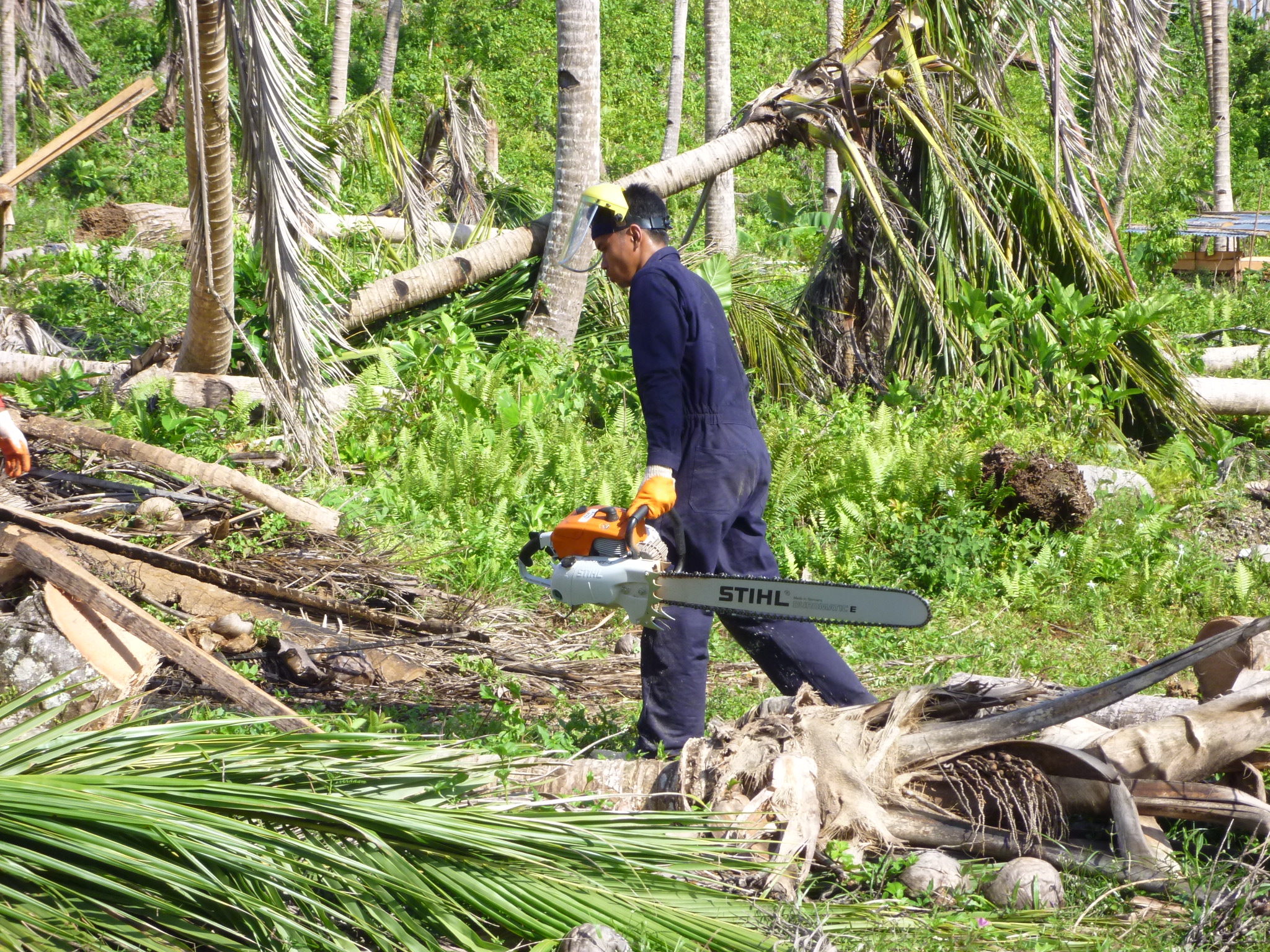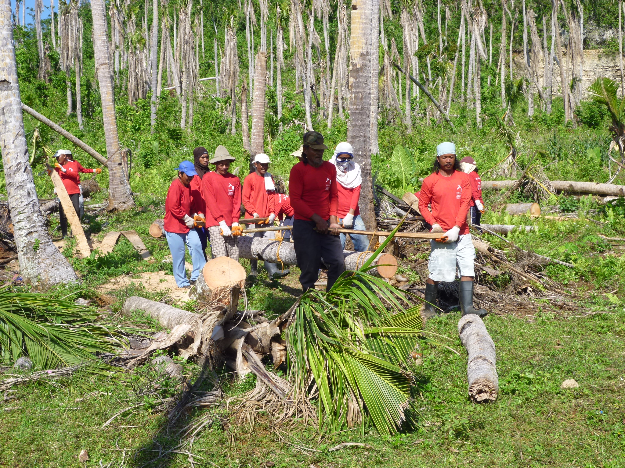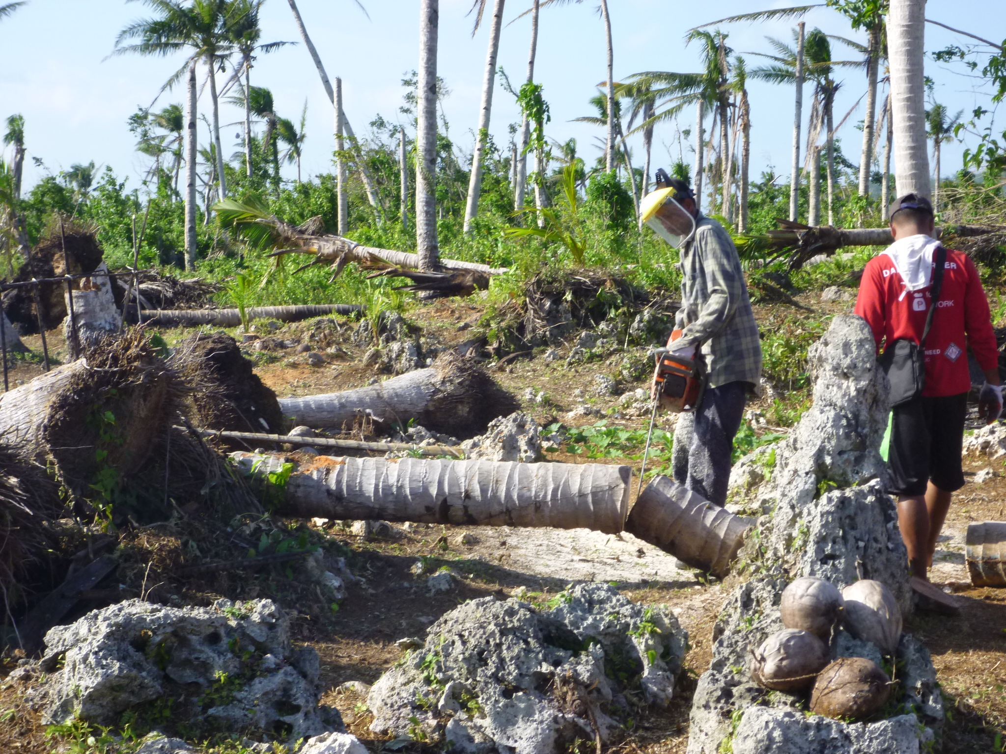Some pics of community members clearing fallen coconut trees as part of a cash-for-work scheme, which will clear the land ready for crop planting, and also reclaim the good trunks that can be processed into lumber for house rebuilding.