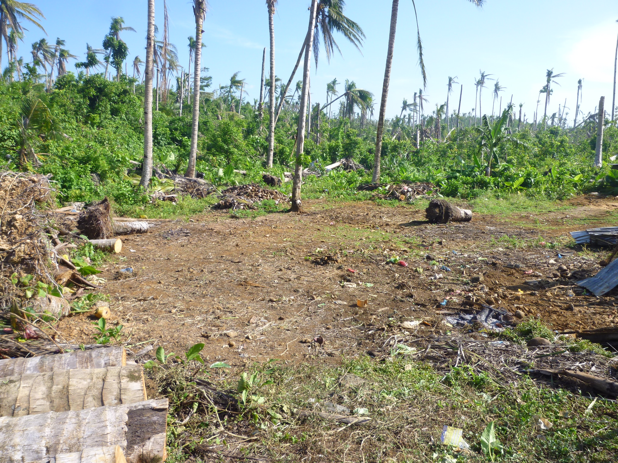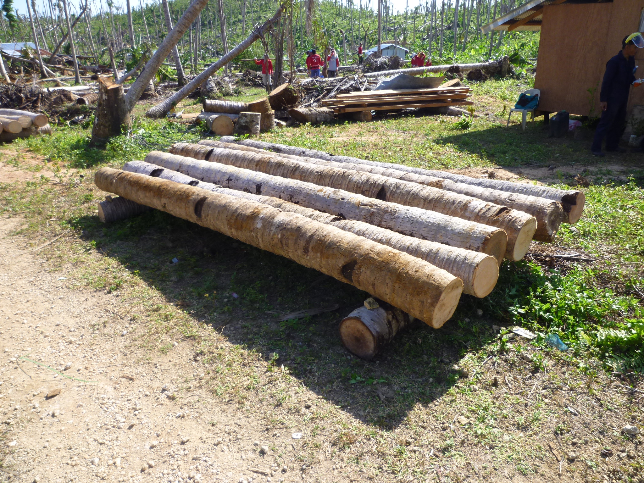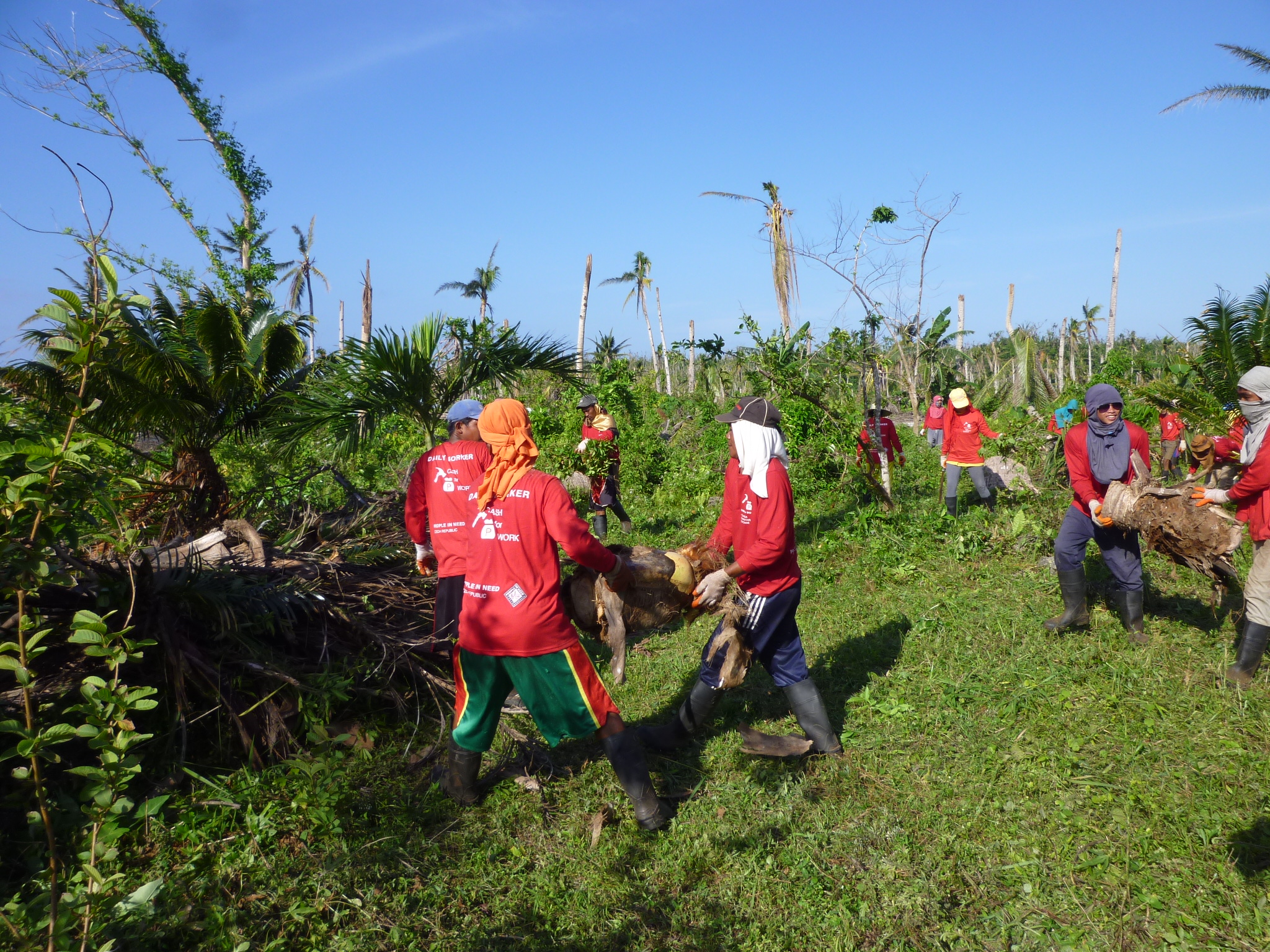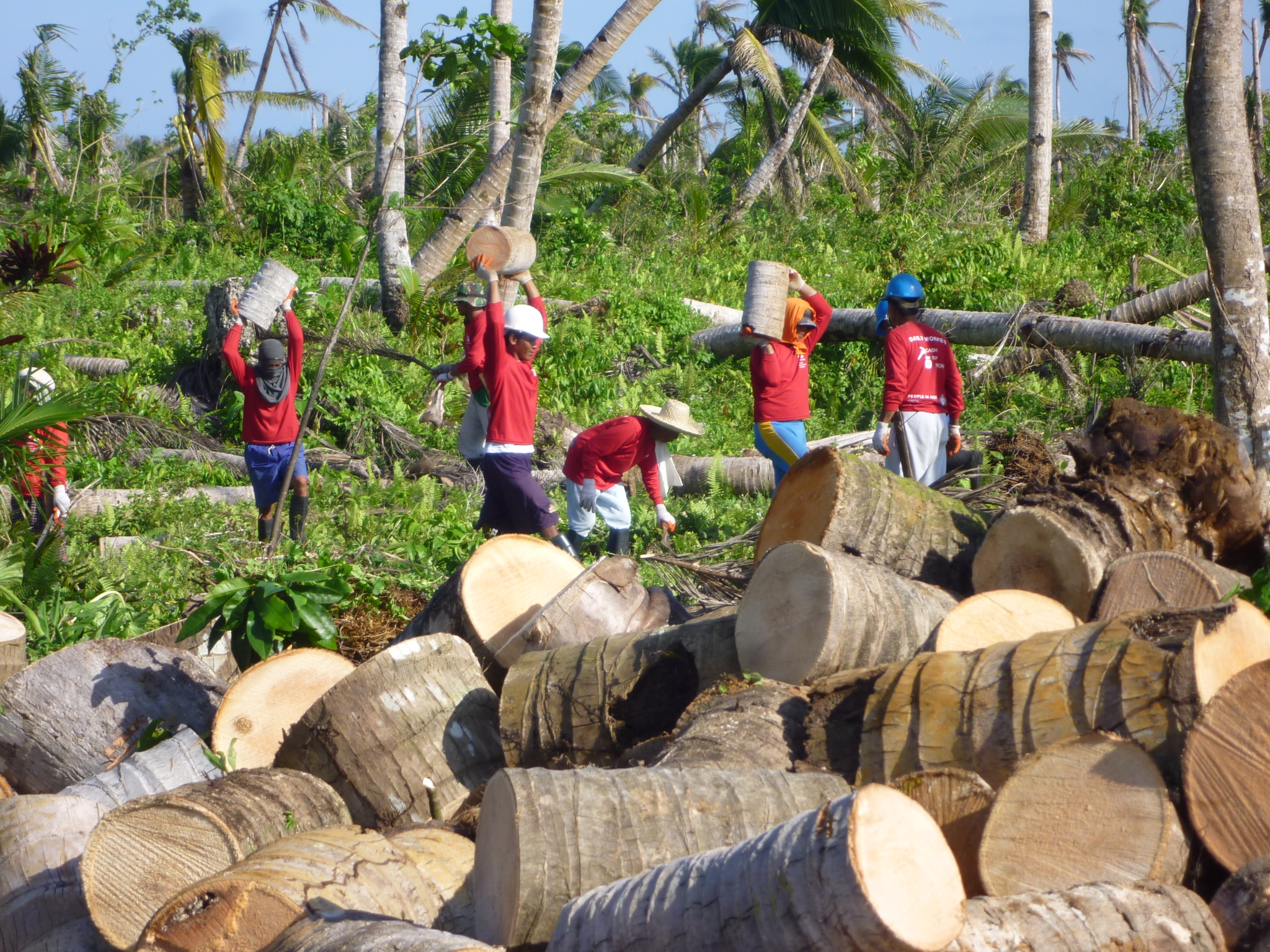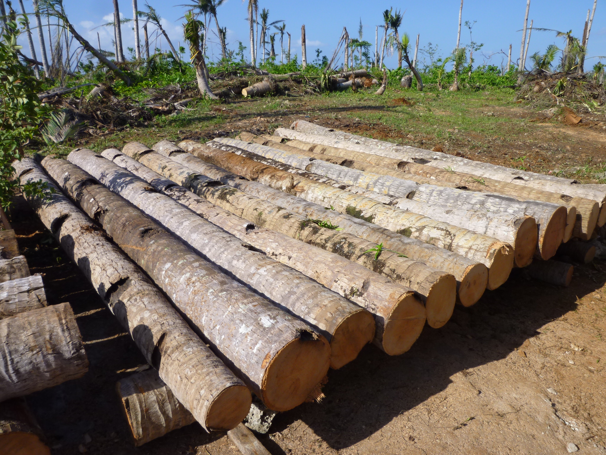 Some pics of community members clearing fallen coconut trees as part of a cash-for-work scheme, which will clear the land ready for crop planting, and also reclaim the good trunks that can be processed into lumber for house rebuilding.