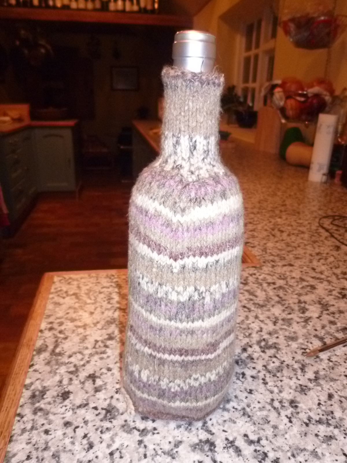 This one is a felted wine bottle cover – I don’t know why you’d need one, but it was the first thing I learned to knit in the round… (Thanks to the Sheep Shop for teaching me!)