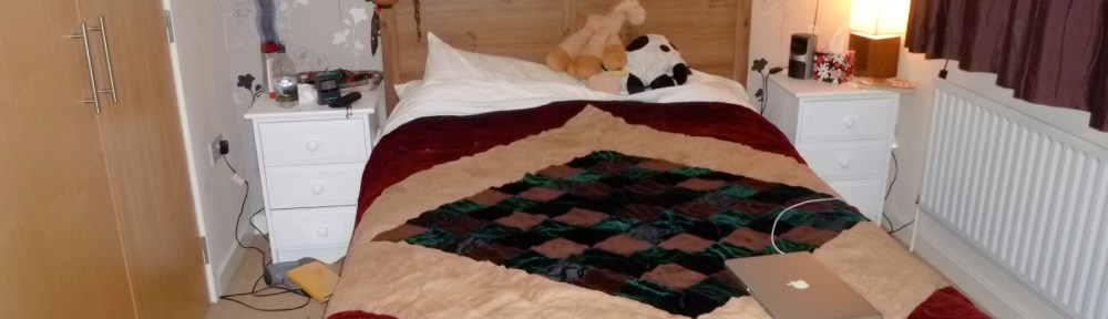 This is the first ever quilt I made – it took me about 10 years, and it was all stitched by hand – no machines except for the edges at the end. It’s made of a mixture of velvet, faux-velvet, faux-suede and what could possibly be described as velour… It’s uber-warm and graces my bed at home – a true labour of love this one!