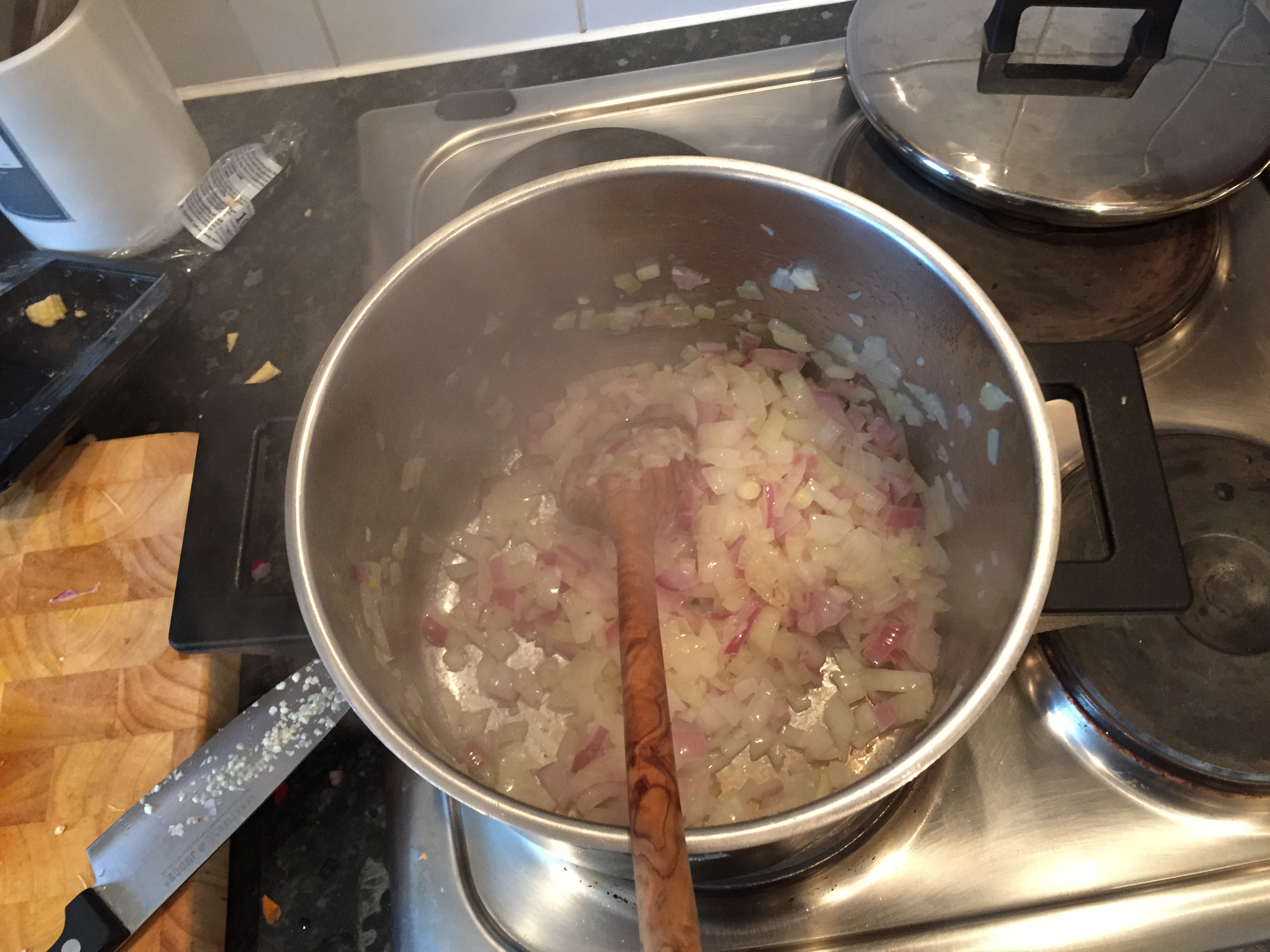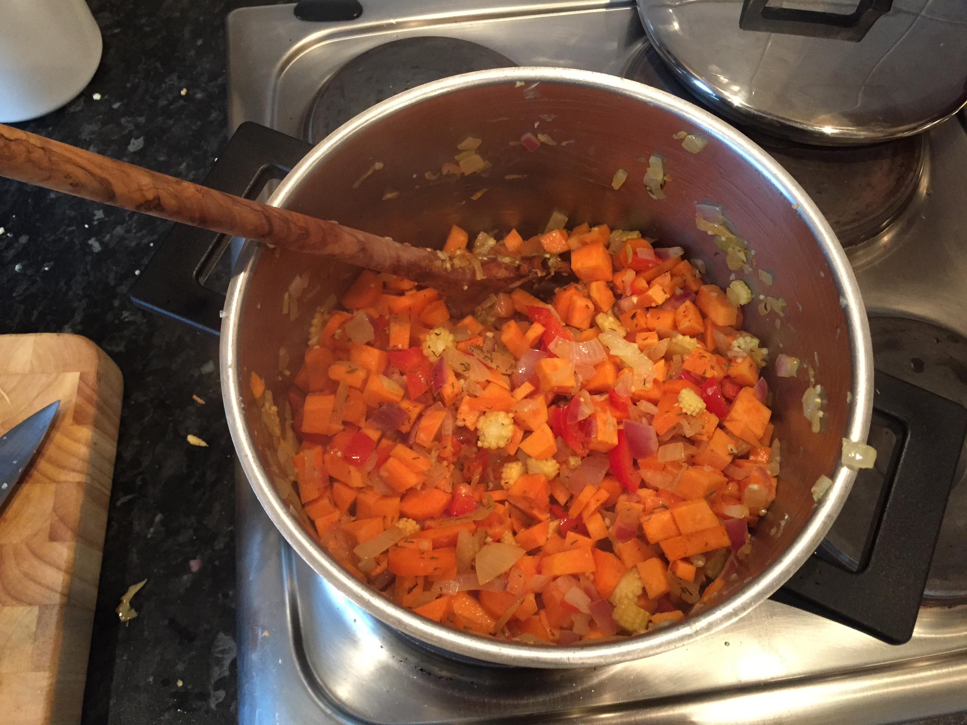 1. Heat the sunflower oil in a large saucepan/pot, and gently fry the onion and garlic until soft. Add all the other prepared vegetables and fry for 5 mins or so until they start to soften.