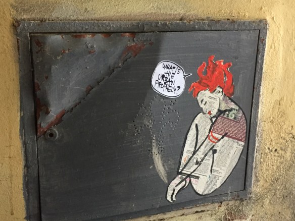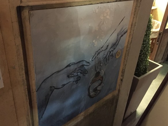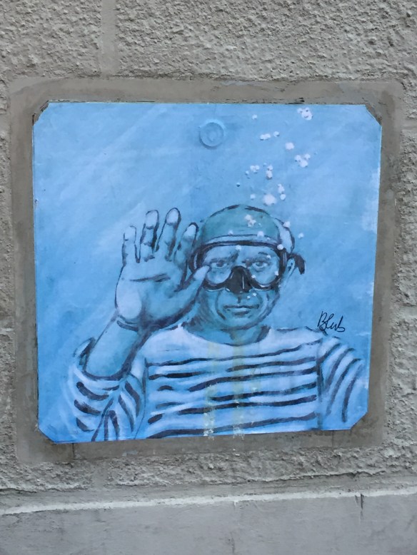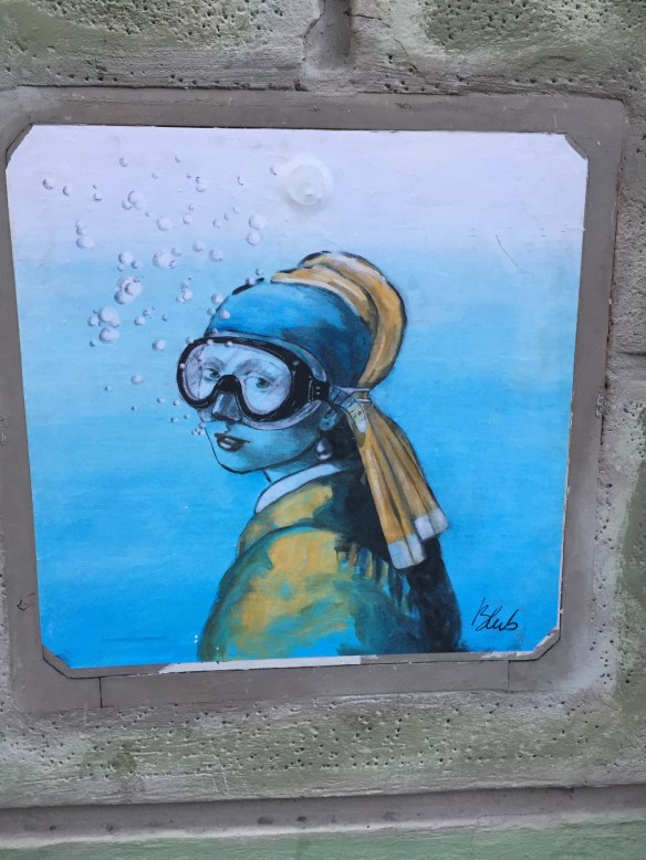 First up, Blub, who creates copies of famous paintings, but always paints them underwater (usually in blue), wearing snorkels. The original paintings are huge (trust me, we found one of his galleries), but he then makes small prints and sticks them onto gas and electricity covers all over the city.