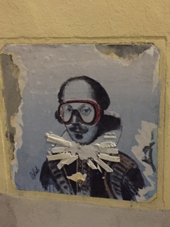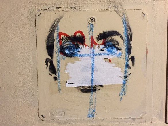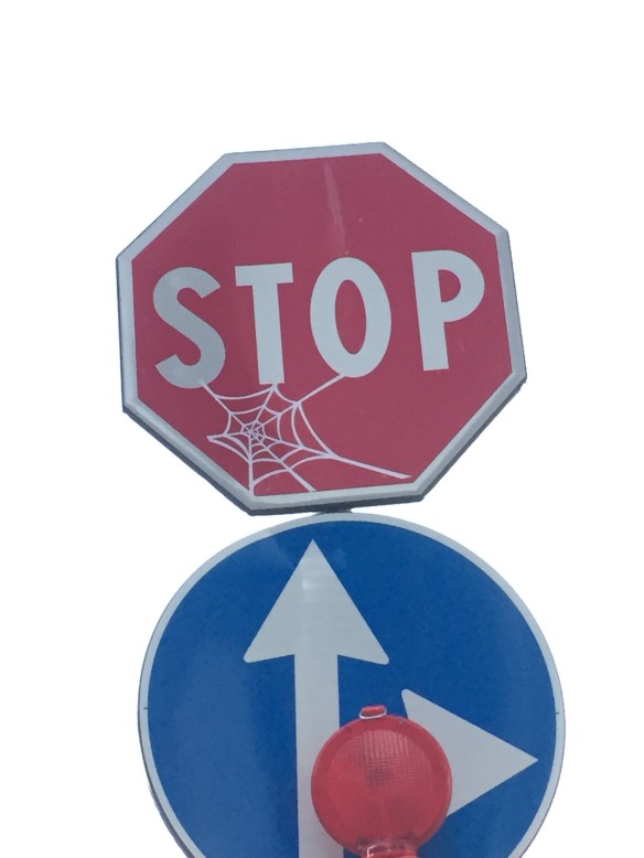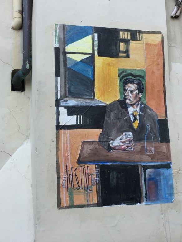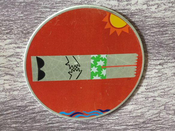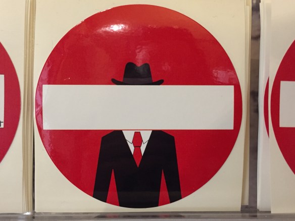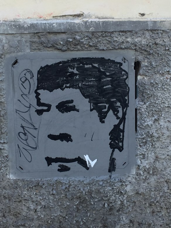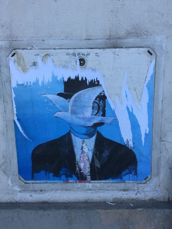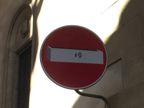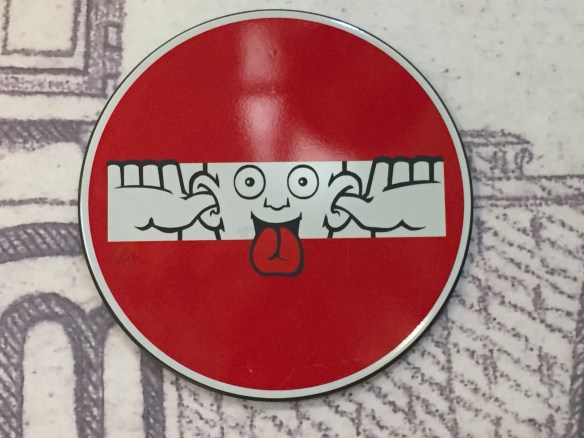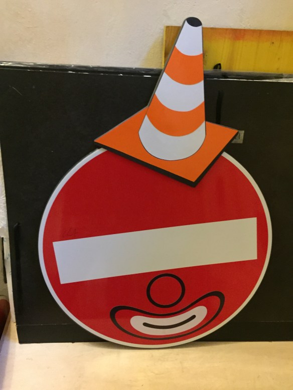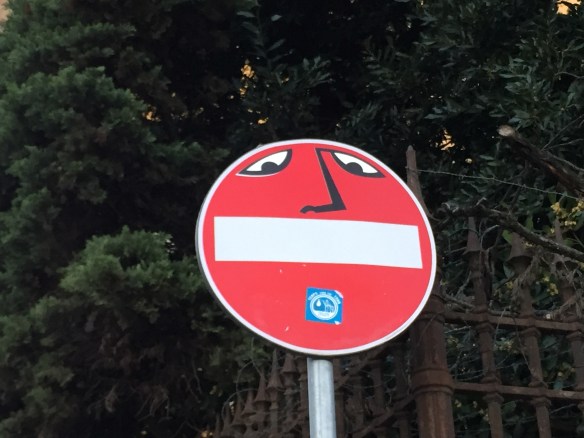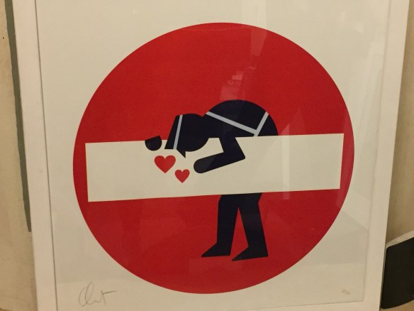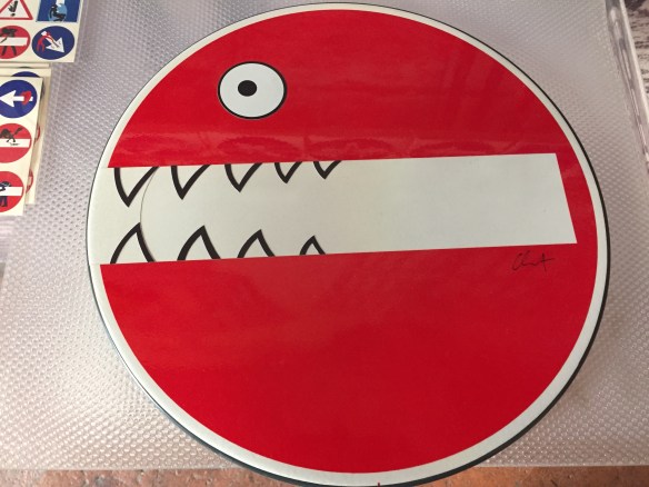 In a rather lovely crossover moment we found this one, which the lady in the gallery informed us was a portrait of Clet, another street artist who does road signs, as you’ll see below. So it was an original Blub picture of Clet!