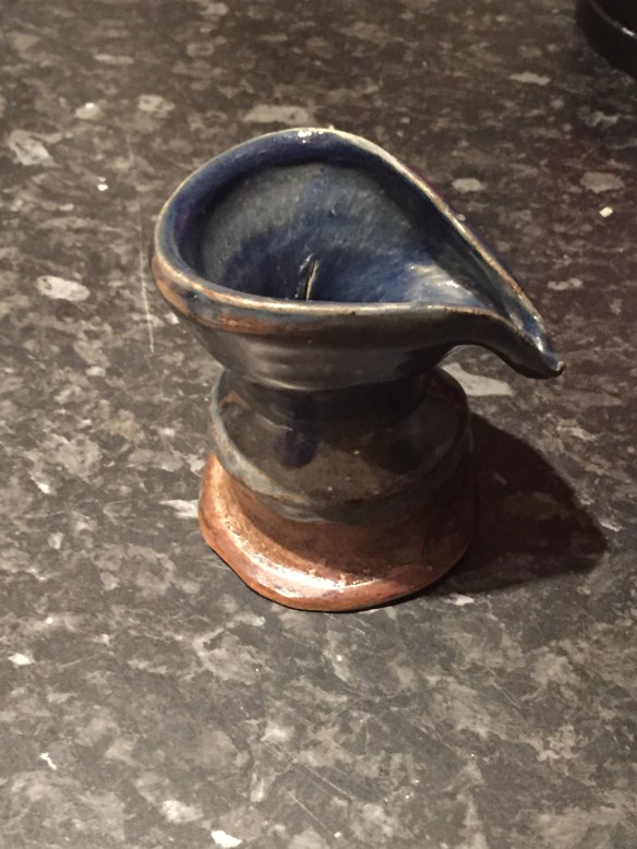 This one was a bit if a mistake but I kinda love it anyway…. It was originally a bowl, but I tried to make it too big and it flopped over on one side after I took it off the wheel. However I quite liked it, so went ahead and fired it anyway. It vaguely reminds me of a hat, or a hand or something, but I reckon it would also look nice with a candle or something in it.
