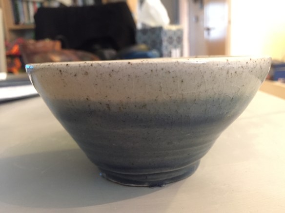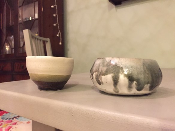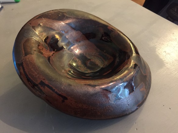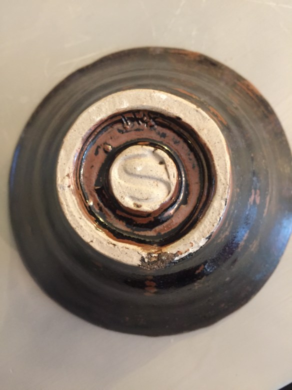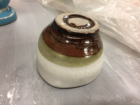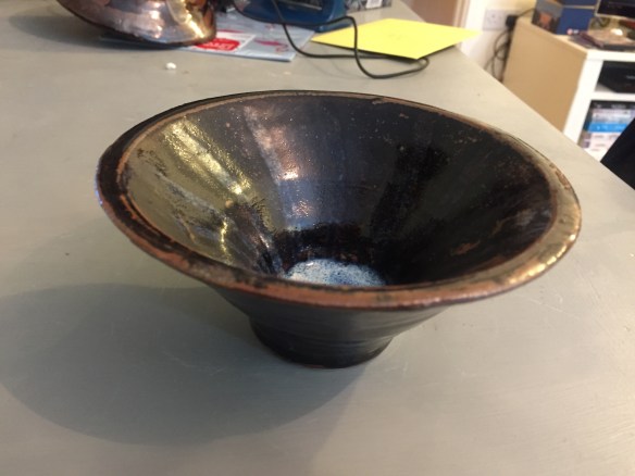 Here’s my funny, melty bowl (glazed in half tenmoku – the brown one, and half Blue Celadon). It turns greenish where the two glazes overlap.