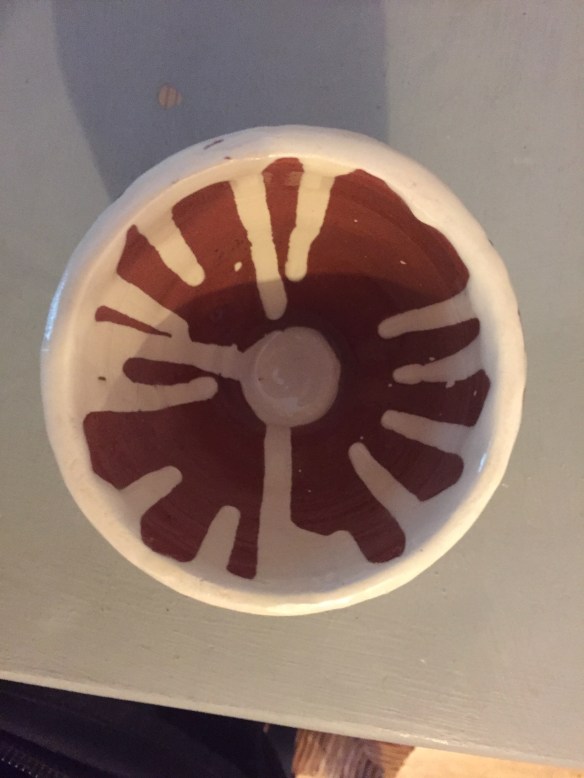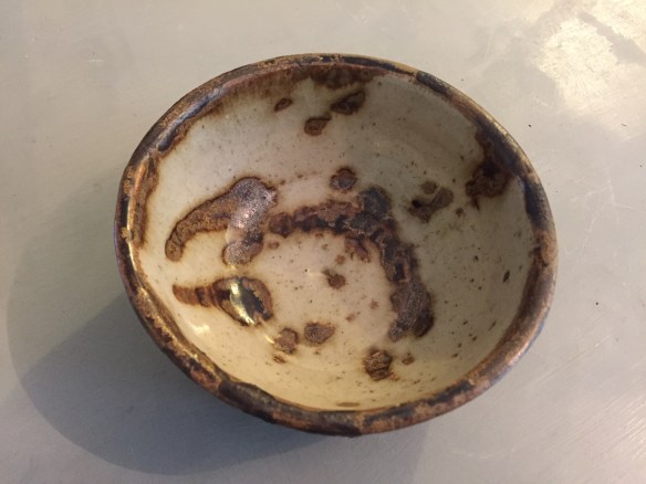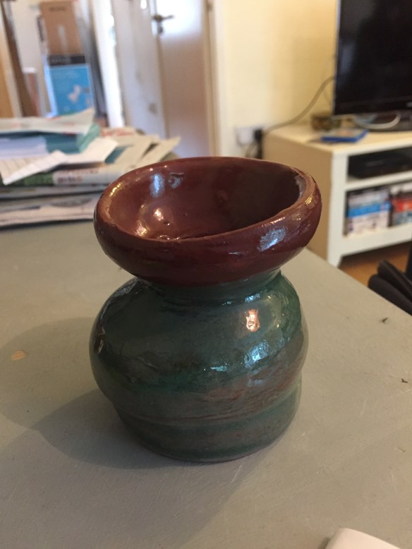 This one was perfectly shaped as a bowl – definitely my best effort yet, but sadly the glaze went all wrong – it was supposed to be brown with lovely bright purply/blue stripes, but the brown is too dark and you can hardly see the stripes at all, so it’s rather dark and boring in terms of colours.