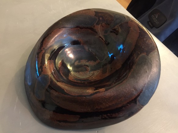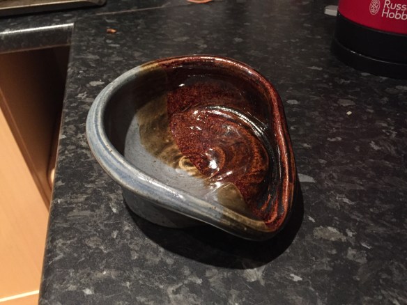 This one was perfectly shaped as a bowl – definitely my best effort yet, but sadly the glaze went all wrong – it was supposed to be brown with lovely bright purply/blue stripes, but the brown is too dark and you can hardly see the stripes at all, so it’s rather dark and boring in terms of colours.