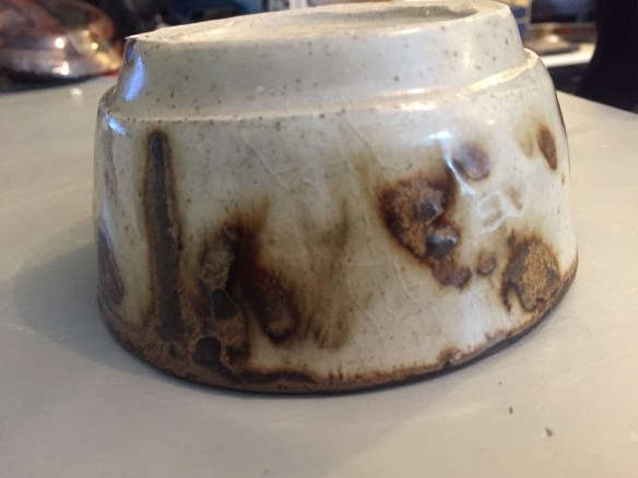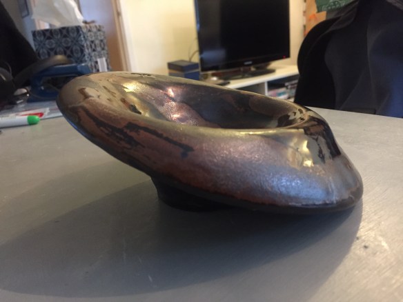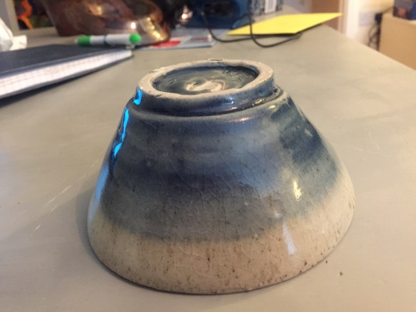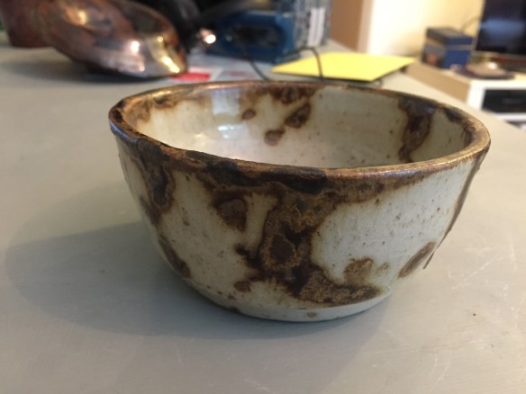 Here’s my funny, melty bowl (glazed in half tenmoku – the brown one, and half Blue Celadon). It turns greenish where the two glazes overlap.