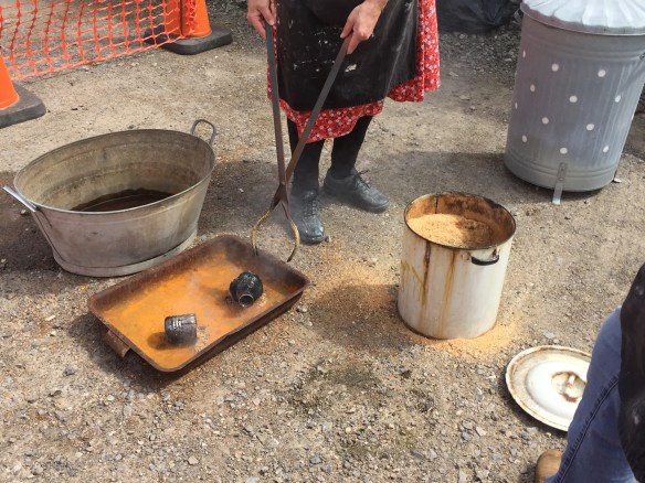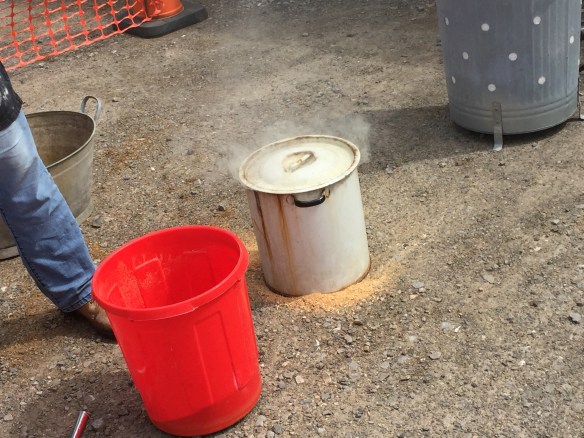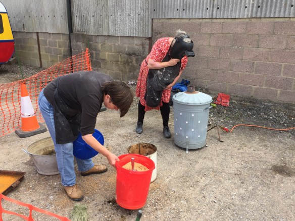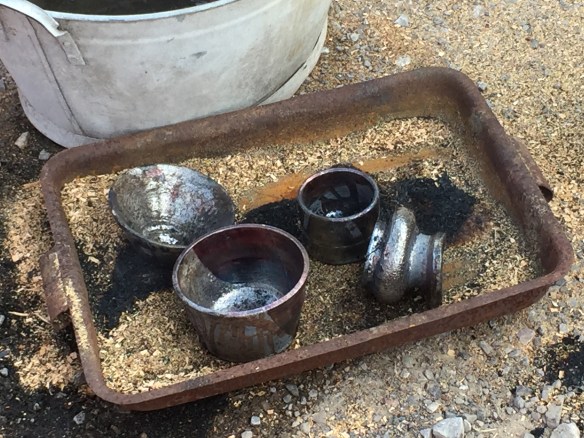 Then as soon as they are removed from the kiln they go into the metal bucket and are immediately covered in sawdust for the reduction process.