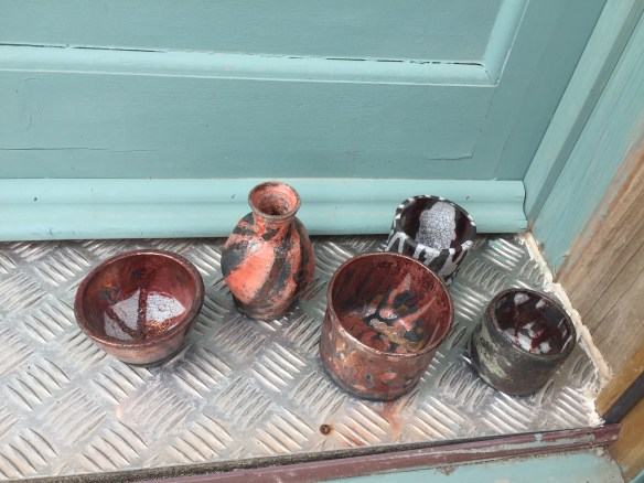 Here are some pots I made beforehand, which were bisque-fired first (these were made out of Crank, a slightly coarser clay more likely to stand up to the Raku firing process!).