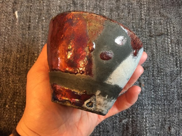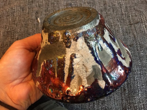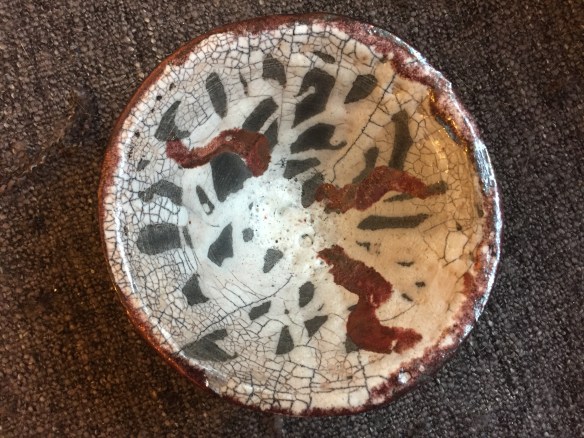 Another bowl with nice white crackle on the inside, but I don’t like the green splodges – wish I hadn’t added those at the last minute…. The metallic edges have a lovely blue-rust colour that changes in the light.
