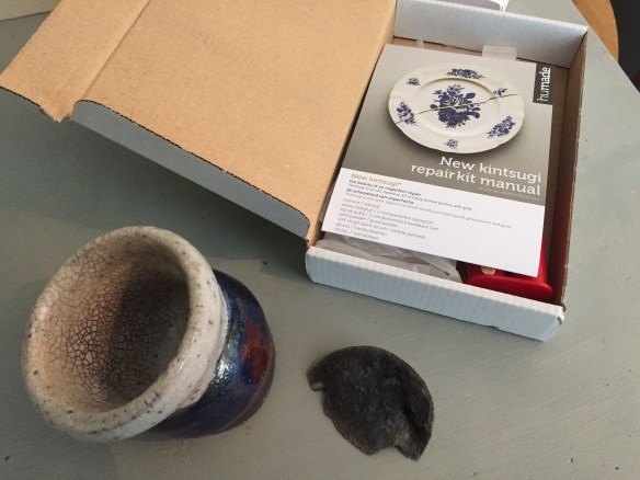 Anyhow, I wanted to fix one of my Raku pots that broke, and thought it might be nice to try out Kinsugi, and so I found a kit online (not real gold though sadly – only gold coloured glue….).