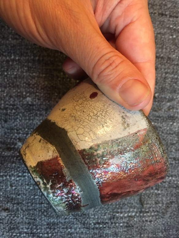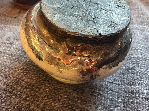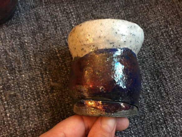And the outside – lovely metallic colours but no crackle on the outside. Also this one broke slightly (the bottom came off) but it gave me a chance to try fixing it with Kintsugi!