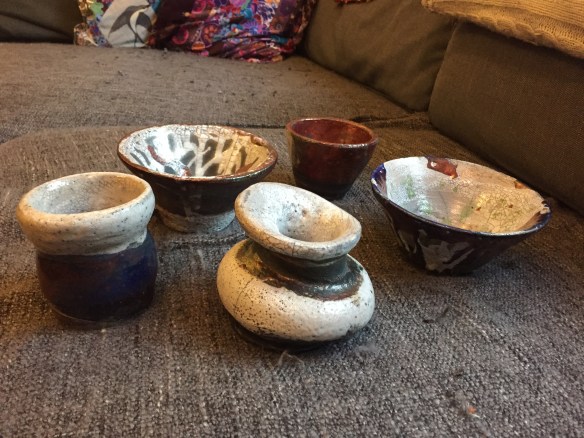 And here are my pots – bit disappointed with some of them, as I put too much glaze on/too thick so didn’t quite get the results I was after…. But it’s a learning curve for next time!