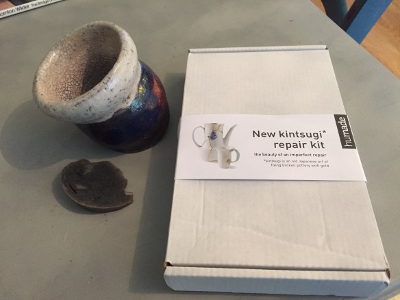 Anyhow, I wanted to fix one of my Raku pots that broke, and thought it might be nice to try out Kinsugi, and so I found a kit online (not real gold though sadly – only gold coloured glue….).