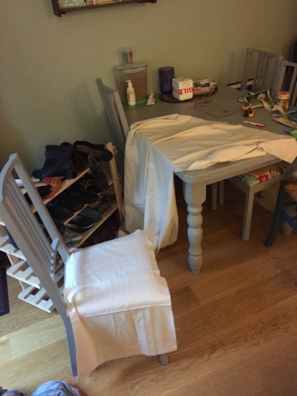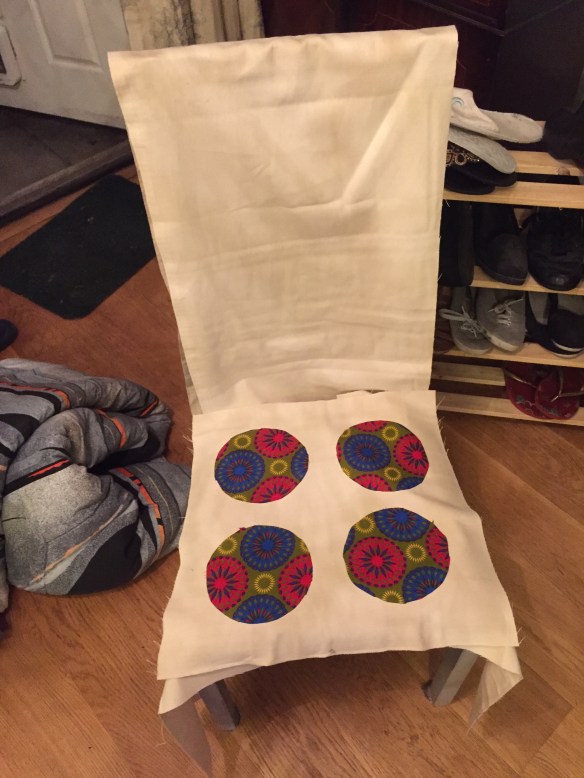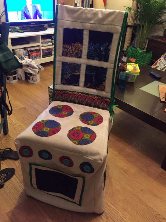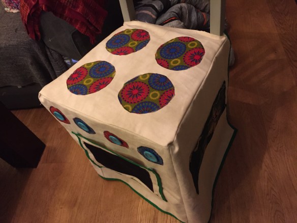 Luckily my god-daughter was about to turn 2, so I had the perfect opportunity to make it!! I was very pleased with the end result – it’s adorable, and the best part is that you can have a play-kitchen for your kids without having to have huge plastic toys and things taking up all the space in your house… It fits over a kitchen chair so you can just fold it up and put it away when you’re done.