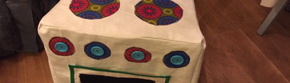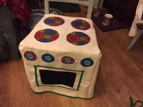 Luckily my god-daughter was about to turn 2, so I had the perfect opportunity to make it!! I was very pleased with the end result – it’s adorable, and the best part is that you can have a play-kitchen for your kids without having to have huge plastic toys and things taking up all the space in your house… It fits over a kitchen chair so you can just fold it up and put it away when you’re done.
