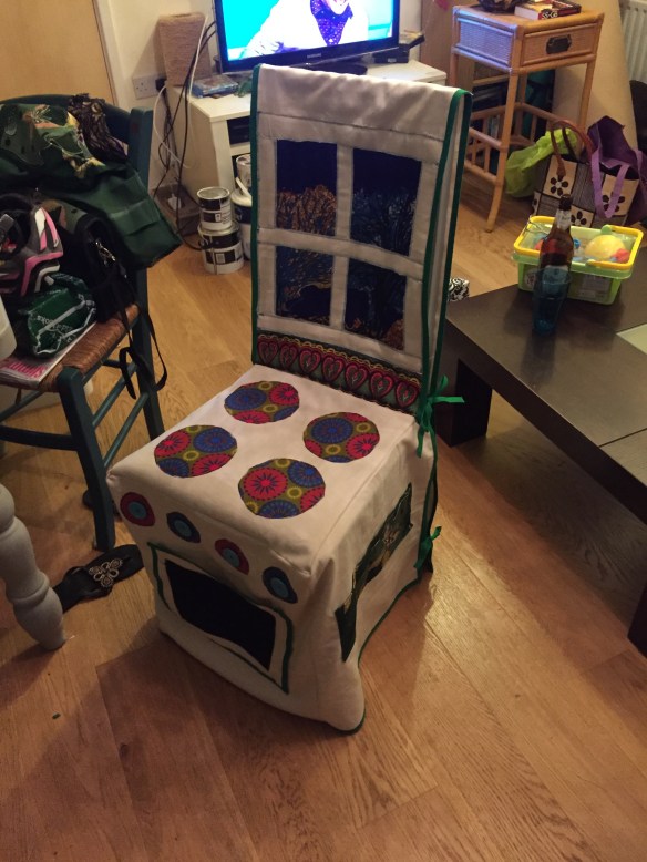 Making the window – I happened to have the perfect fabric for this – deep blue with trees on from the market in Nairobi (I actually have a lovely dress in this fabric, and this was one of the leftover scraps). I didn’t bother adding curtains though, as they would have covered up the lovely window fabric!