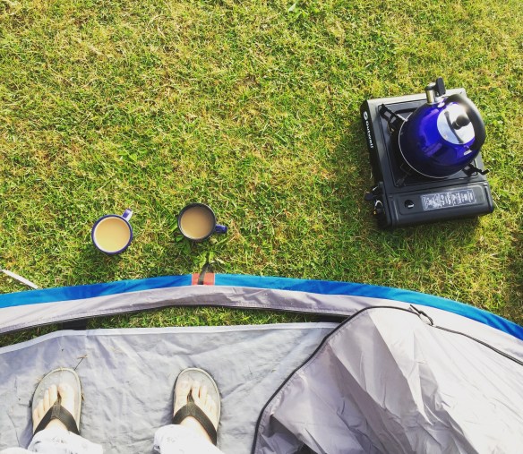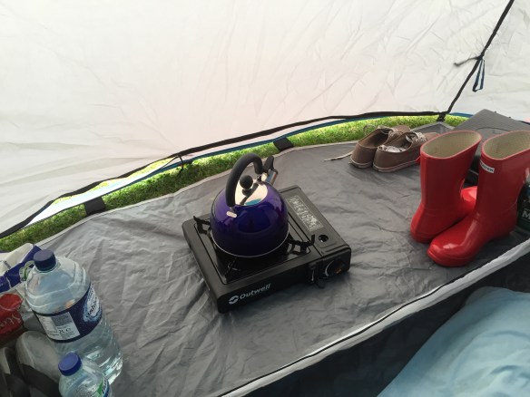 Another slightly wet and damp morning – making tea under the cover of my tent!