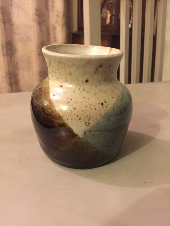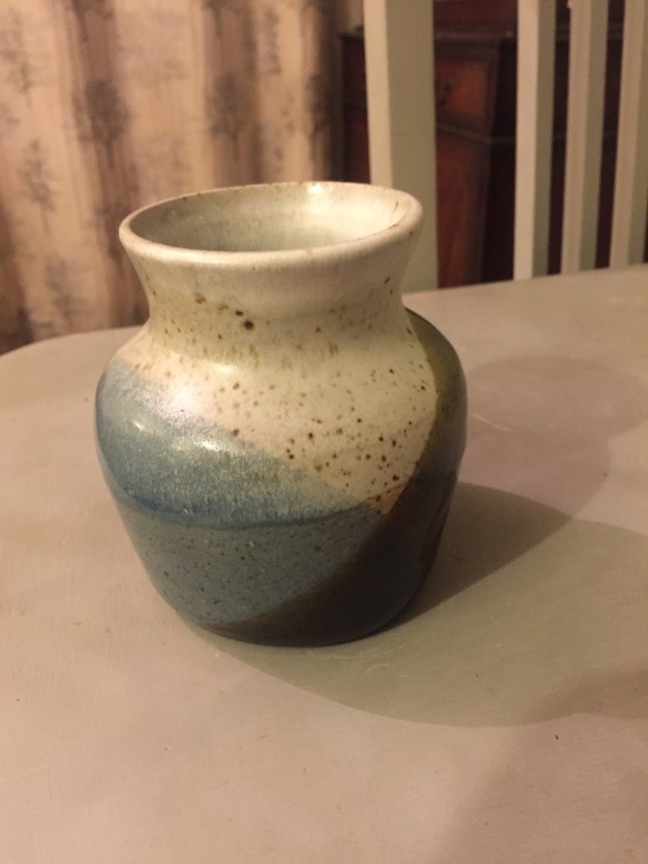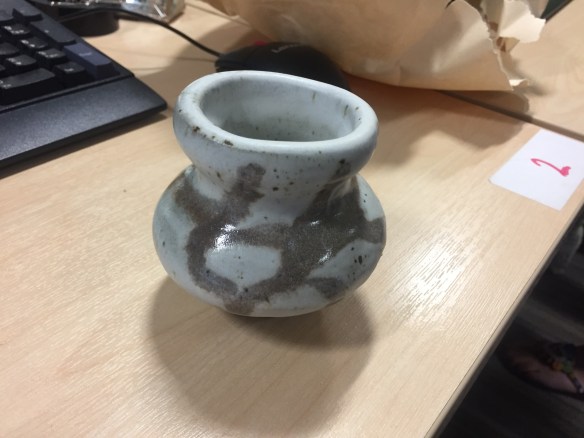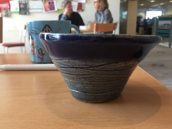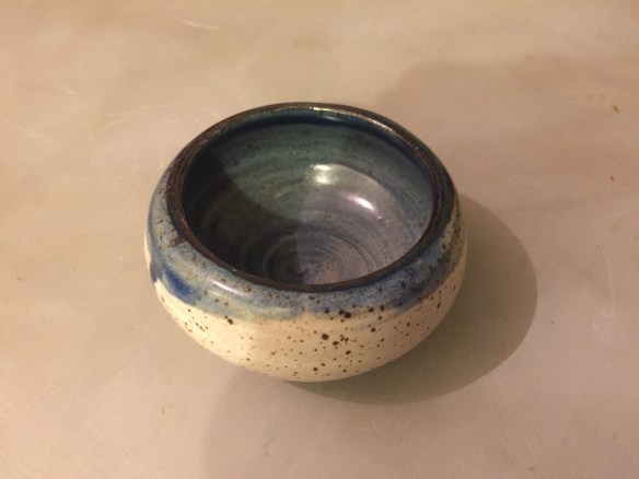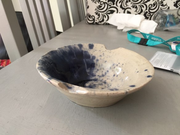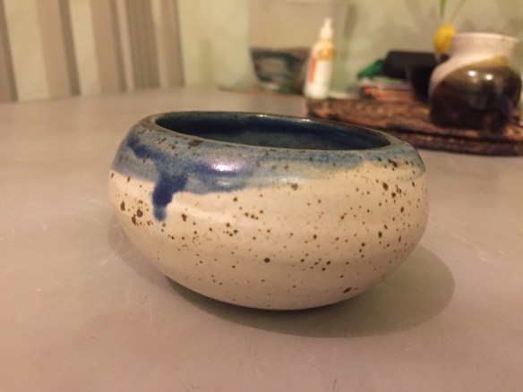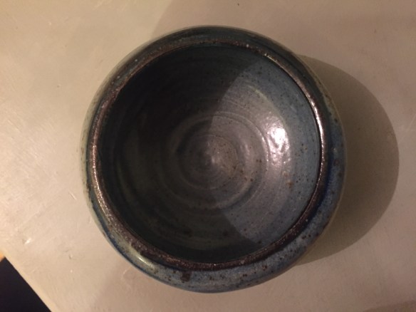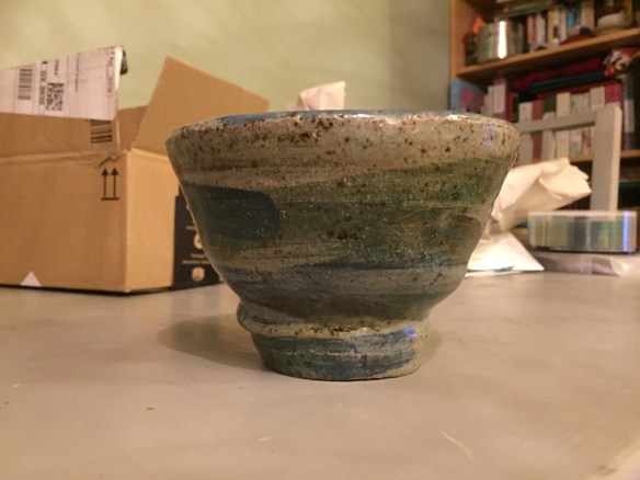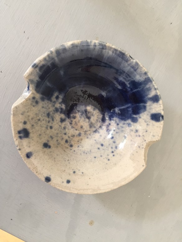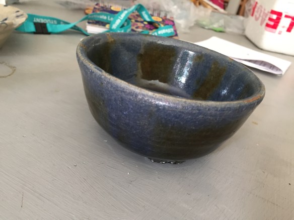 This bowl was lovely and symmetrical, and the glaze came out beautifully (I usually get either a wobbly bowl and nice glaze, or great bowl and crap glaze) – sadly it melted onto the kiln shelf and so the bottom is rubbish.
