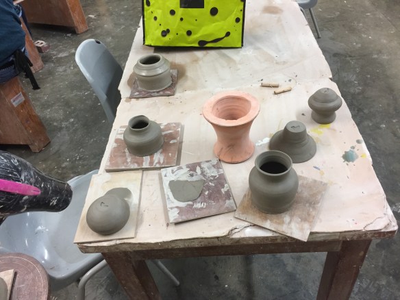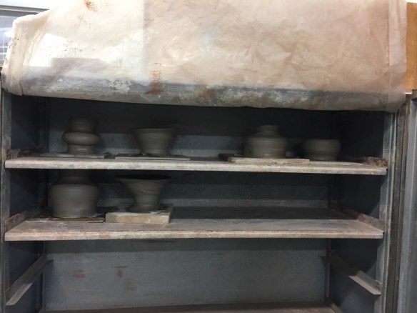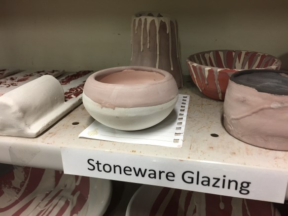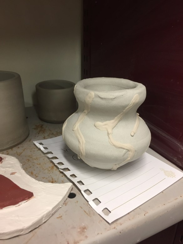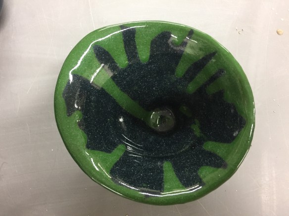 Glazed and ready to go into the kiln for a second firing (this one is cheating slightly, as I didn’t make it – my instructor made it for me to show me the technique and I decided to glaze it to test out some colours.