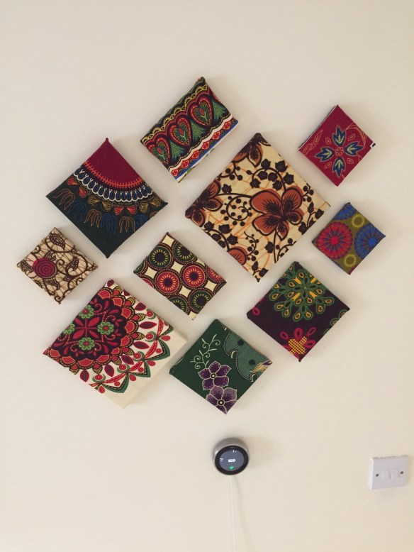 Hanging my new collection of canvasses covered with my African fabrics – a lovely little reminder of my trips to Senegal and Kenya! And I had the excuse to buy a staple-gun!