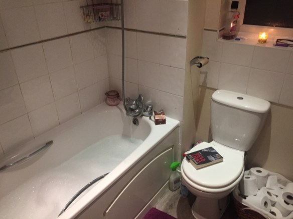 A very rare yet indulgent bubble bath, complete with candle, book, homemade body scrub and some relaxing music…. Lovely.