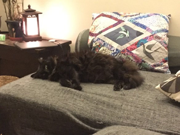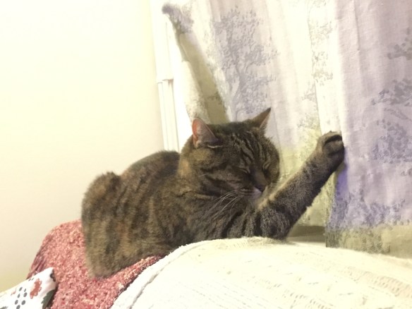 Tiggy loves to sleep on the back of my couch with her claws hooked into my beautiful curtains, which I am always trying to discourage!