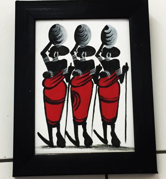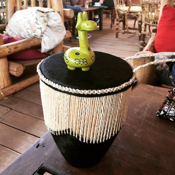 A sample of my purchases – lovely goat-skin drum and a hilariously fat giraffe carved out of soapstone.