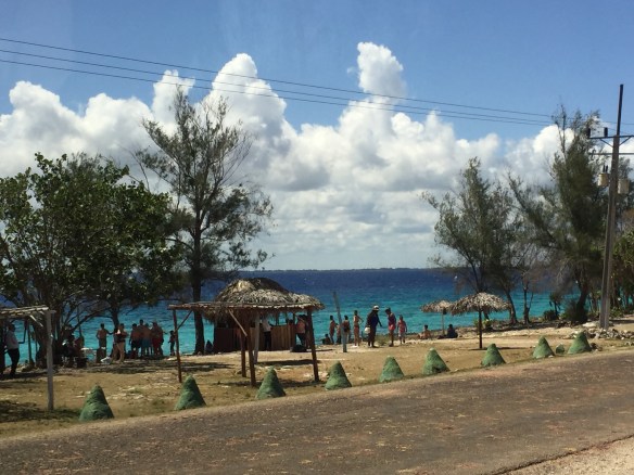 On the way from Vinales to Ciefuegos we stopped off at the Bay of Pigs for a swim. Here is the bay itself (all the marks on the road are about a thousand poor crushed crabs that obviously tried to cross the road – it’s crab roadkill…)