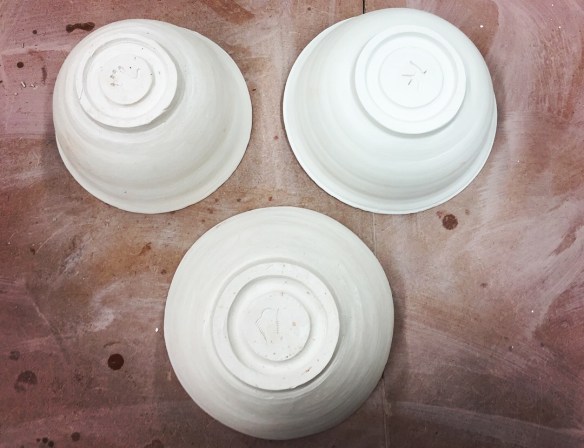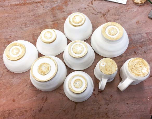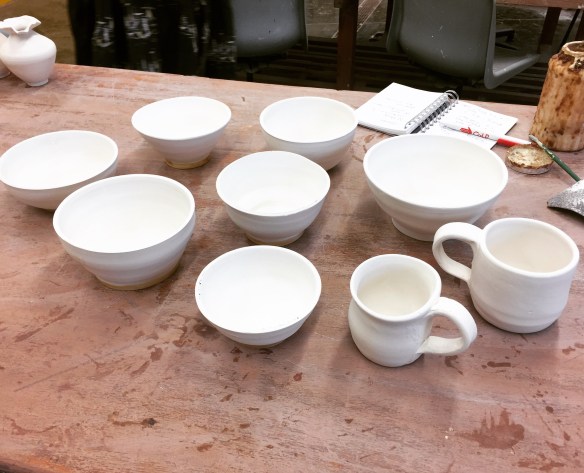 Some finished bowls and things, turned and on the drying shelf ready to be bisque-fired (the first firing)