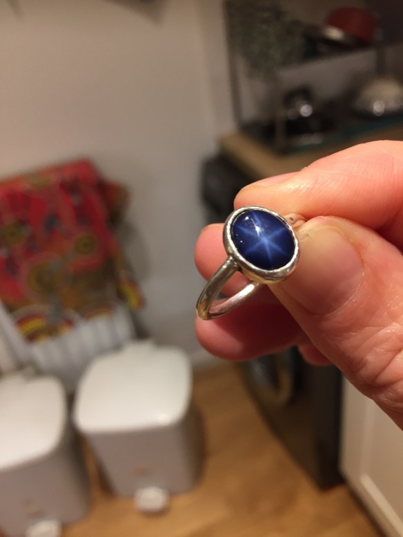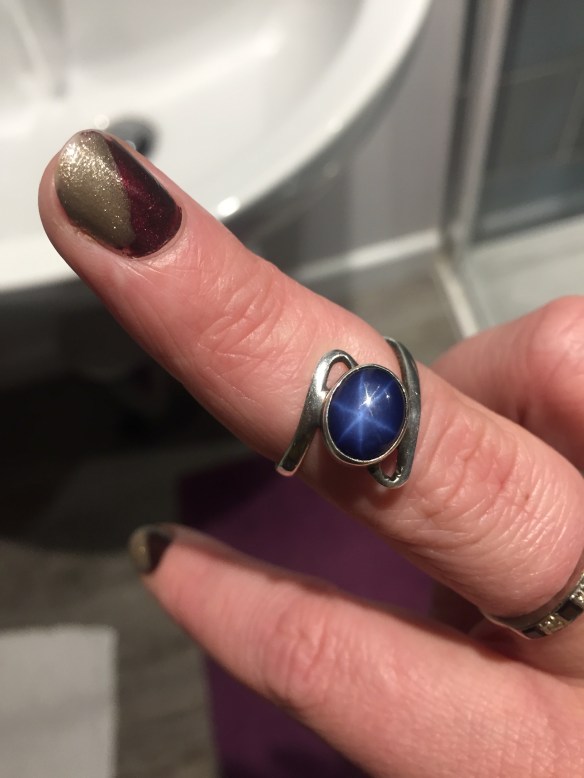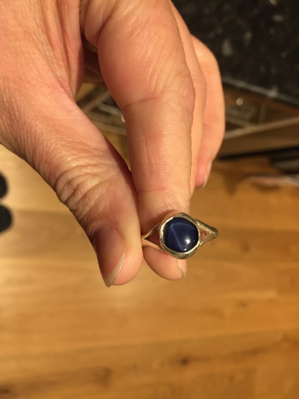 It’s a star sapphire, which I love – it looks like a plain blue stone, like a lapis, most of the time but when it catches the sunlight a star appears in the centre of the stone. It’s like magic and I love it.