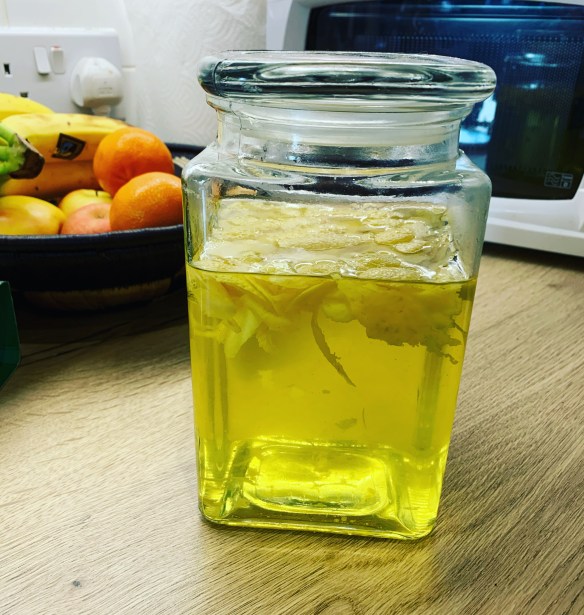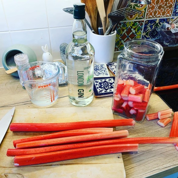 Add sugar (I can’t remember how much – google it!) and leave the rhubarb and sugar for 24 hours to start drawing the juice out. Then add the gin and sliced ginger (i just guessed at how much, and added some more later on) and leave in a dark cupboard for a few weeks.
