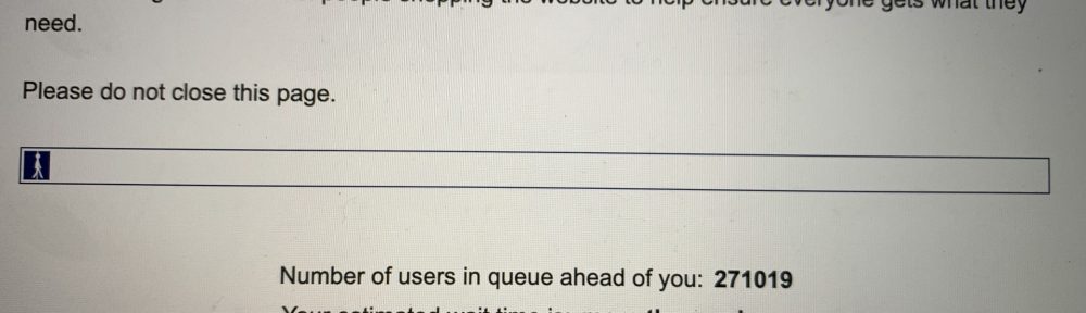 Washed a few more curtains. It’s surprisingly enjoyable even though they look exactly the same afterwards, (I’LL know how clean they are). Had the plumber back after it transpired they had not successfully fixed the leak in the bathroom at all. Hoovered. Wondered if my car battery will die from lack of use. Decided to do more online shopping and have a look at summer clothes for the kid – I love Boots Mini Club stuff, but discovered that there is a queue to get onto their website now and there were LITERALLY 271,000 people ahead of me in the queue. Astonishing.