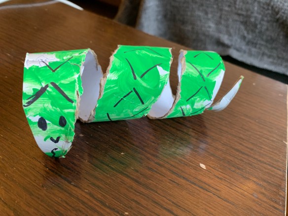 We used some of the toilet-roll tubes we painted yesterday to make a snake and a butterfly.