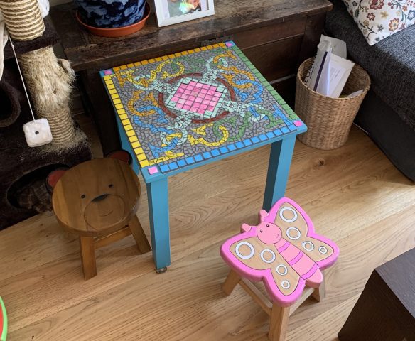 Dropped off a couple of bits from the shop to my friend as our outing for the day. Was nice to sit in her garden (more than 2m apart of course) and chat in the sun for a bit. She also gave us the most amazing gift – a little kid’s table that she has made a mosaic on! The kid LOVED it and insisted on sitting at her new table for snacks and dinner!