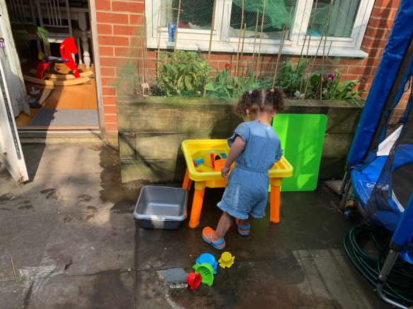 The afternoon was slow and tiring. We did some painting and some more water playing. Drew some chalk pictures on the ground in the garden and played with the doll’s house. Tried to watch Paddington and realised I’m so tired I couldn’t really follow the plot, which is just so sad and depressing.