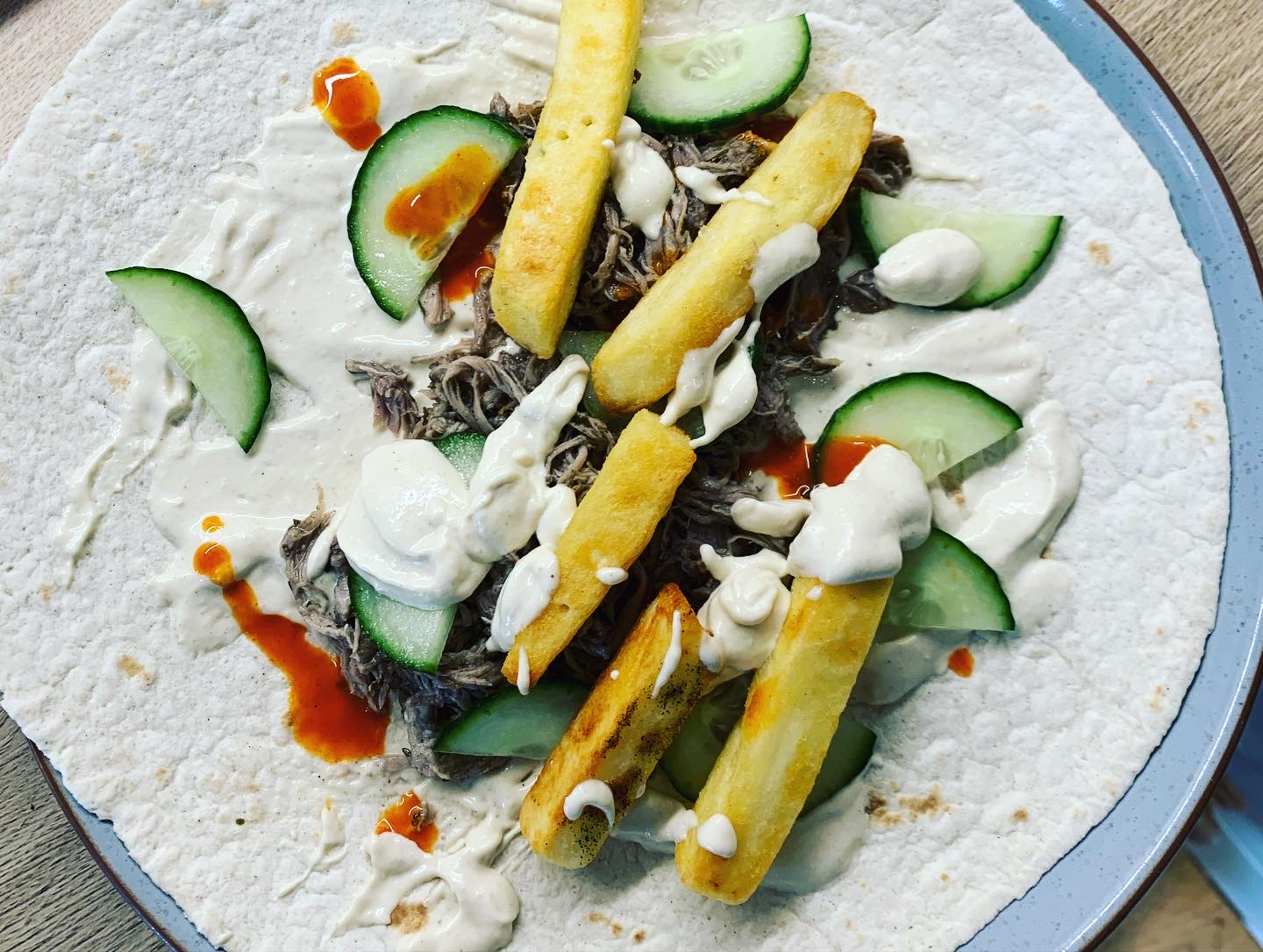 Slow-cooked lamb shoulder with tahini garlic sauce Gyros/Scharma:
