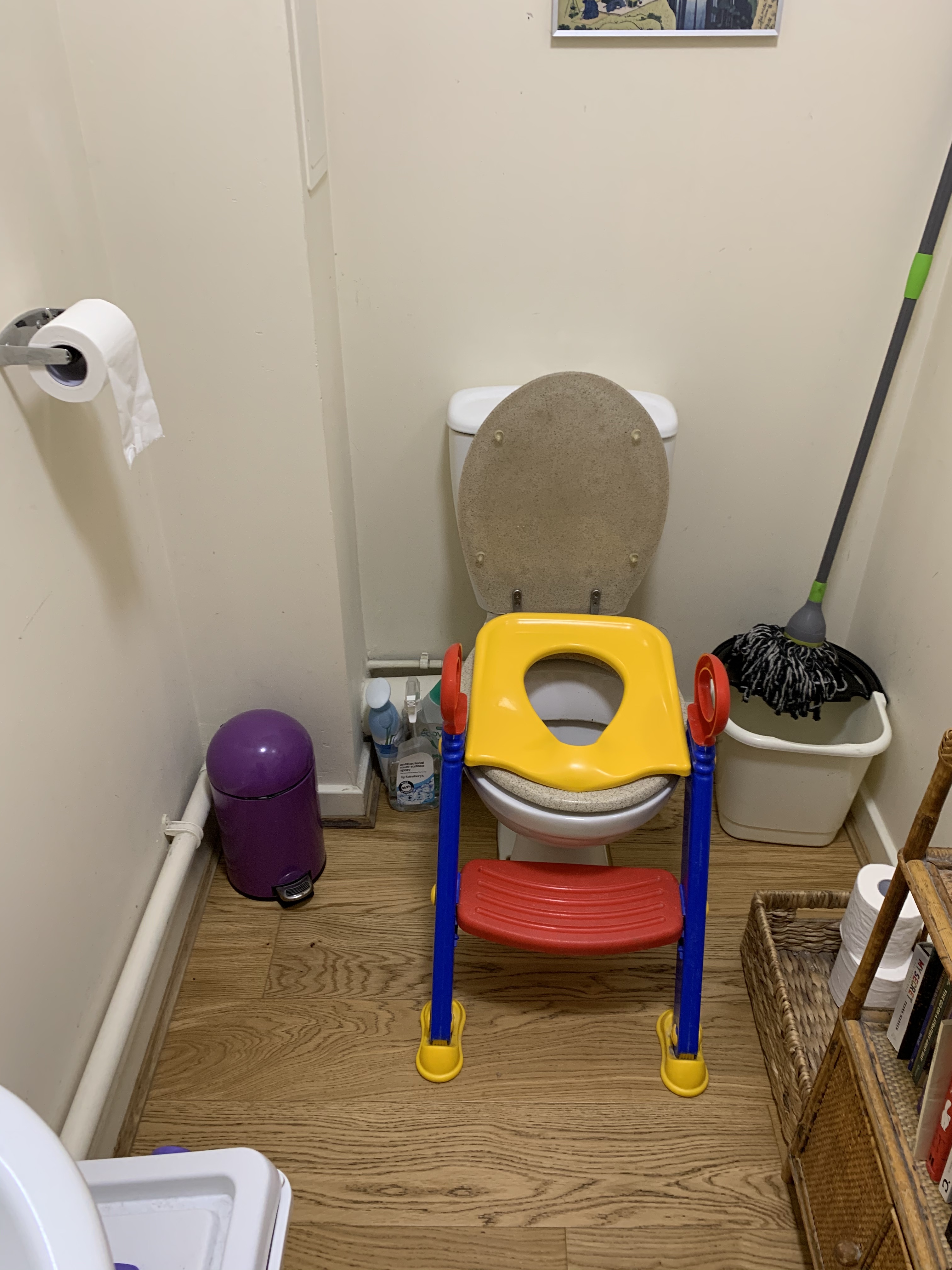 Also I hadn’t really thought through some of the logistics of it all. I mean, potties are fine, and close to the ground, but when they want to use the toilet, they need a step like this: