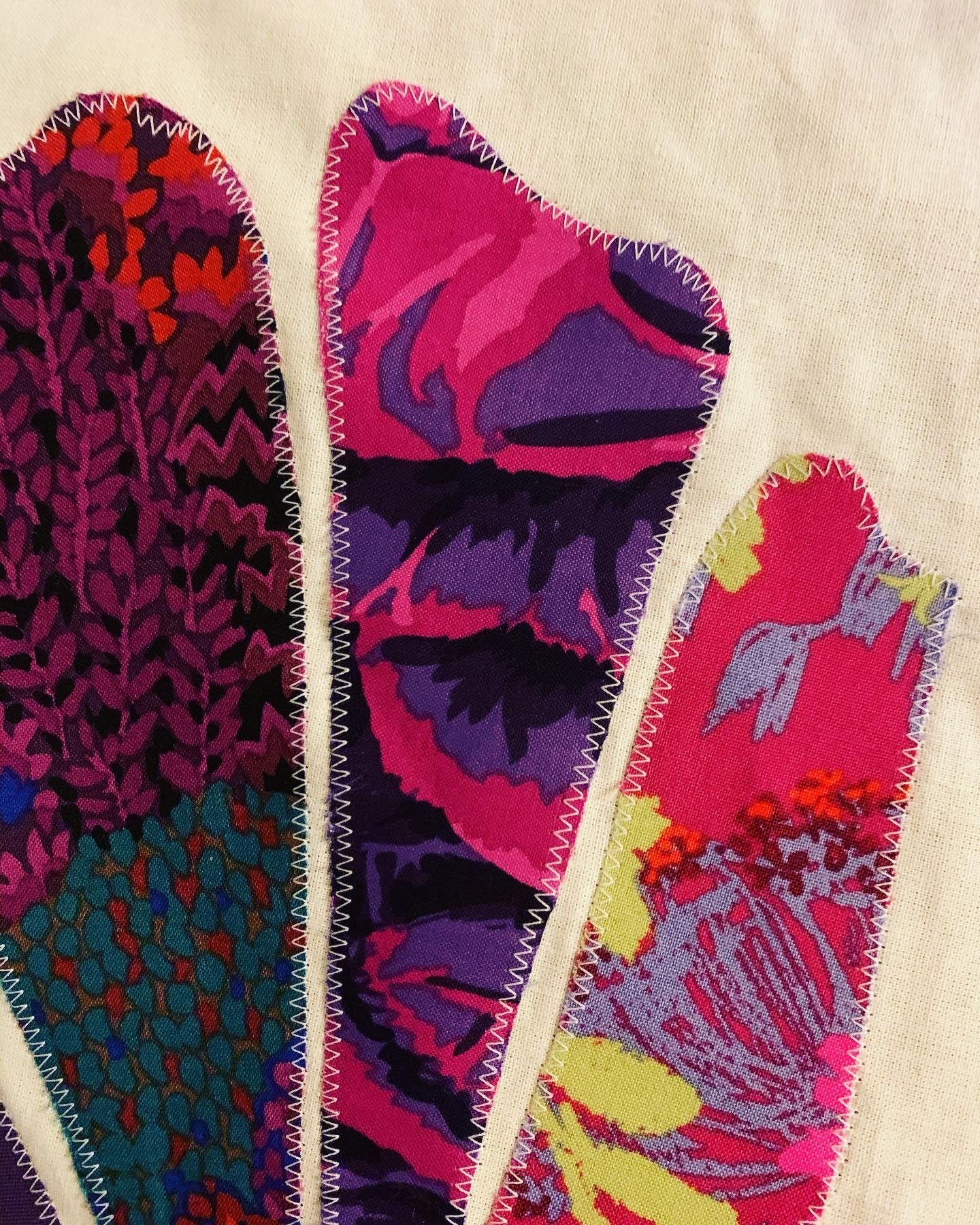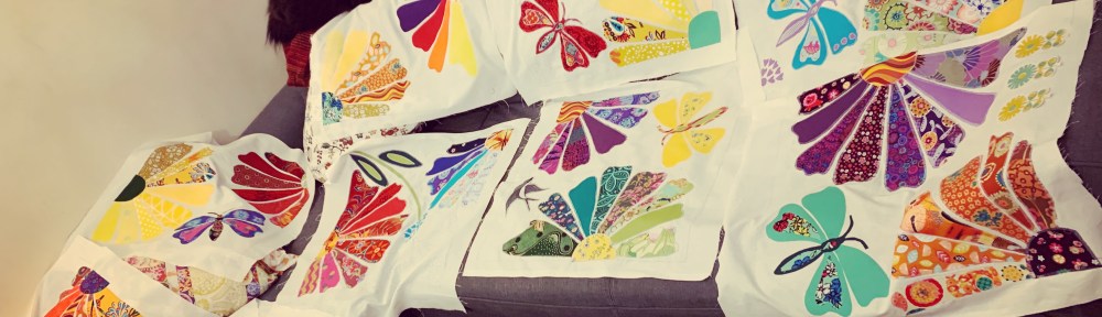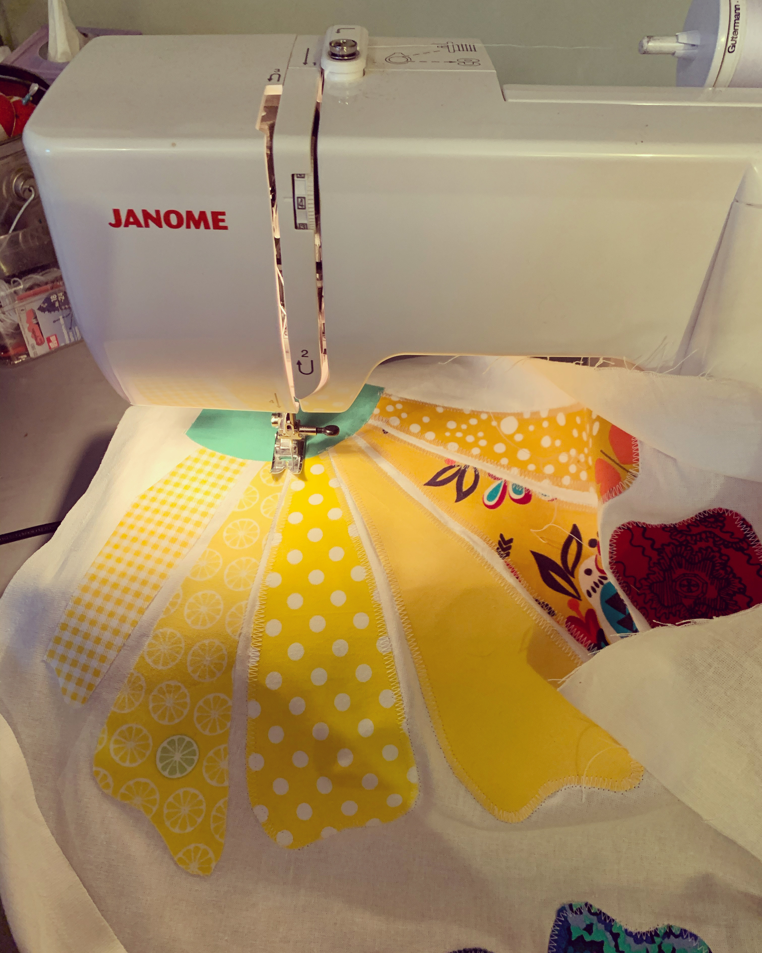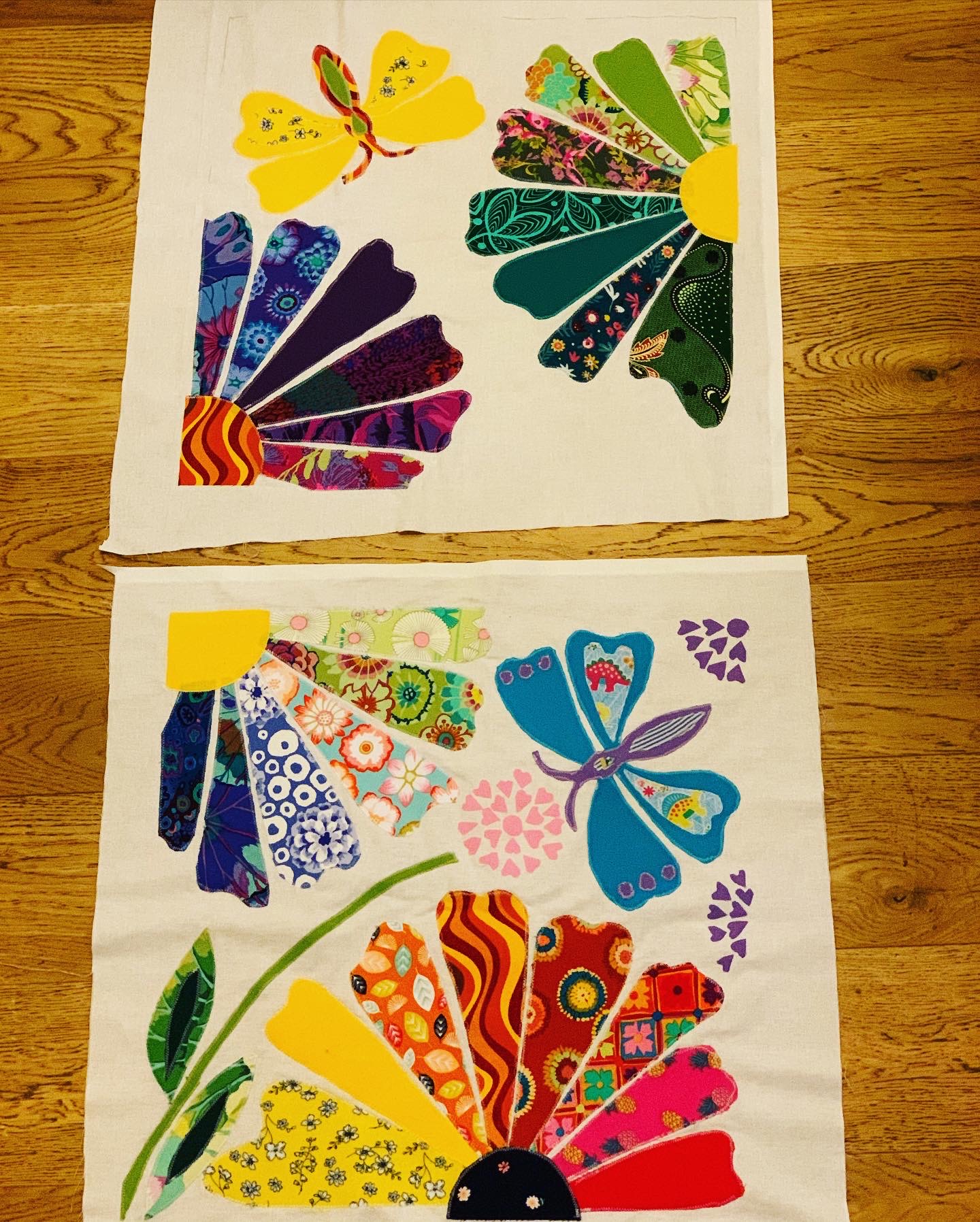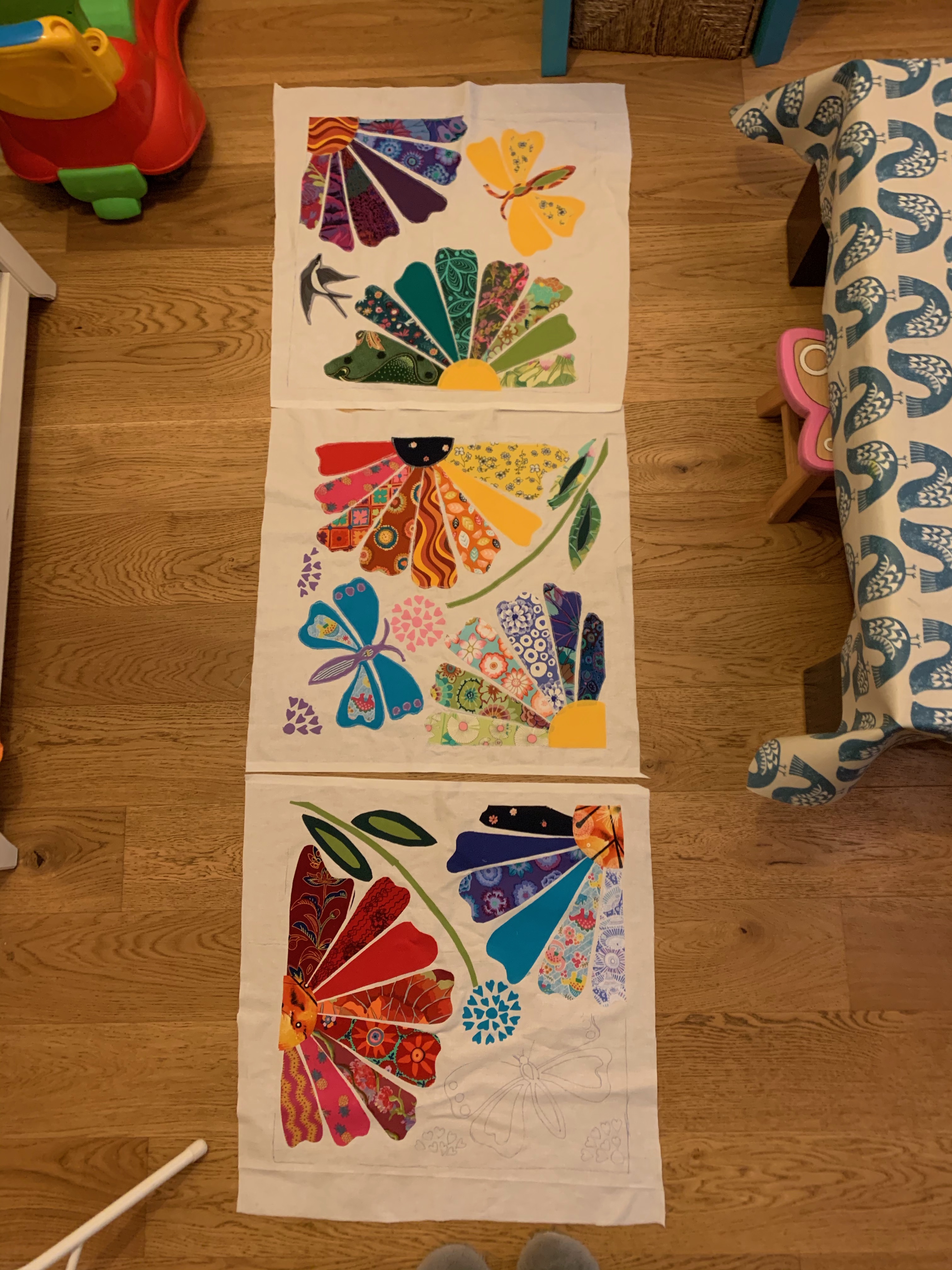 It’s a paper-piecing technique where you cut out the shapes using the template provided (its the same template for every square) and then use double-sided sticky paper (fusible web as it’s often known) to iron it into place on the fabric. Then I sewed around all the edges to hold them in place and stop any fraying.