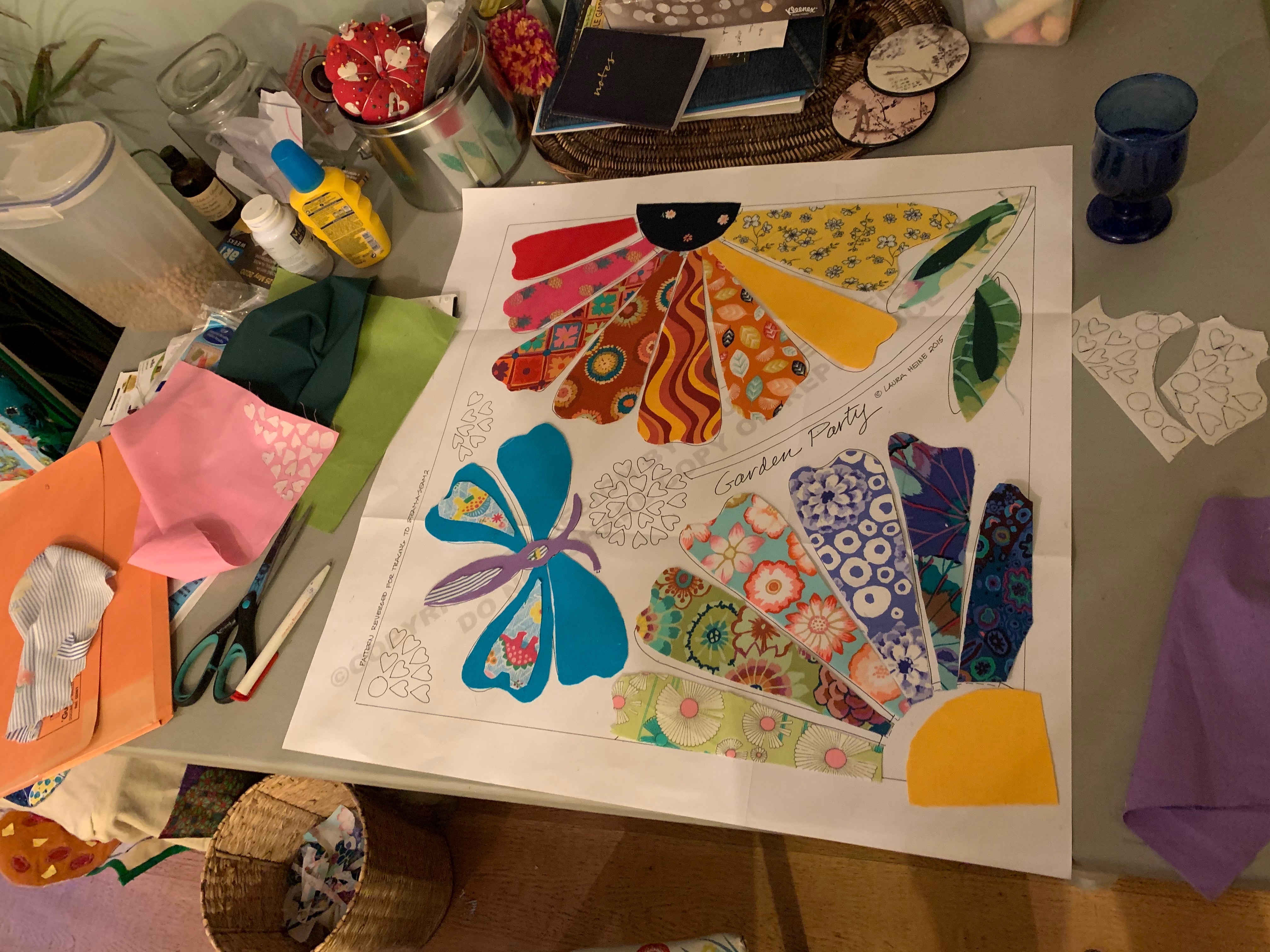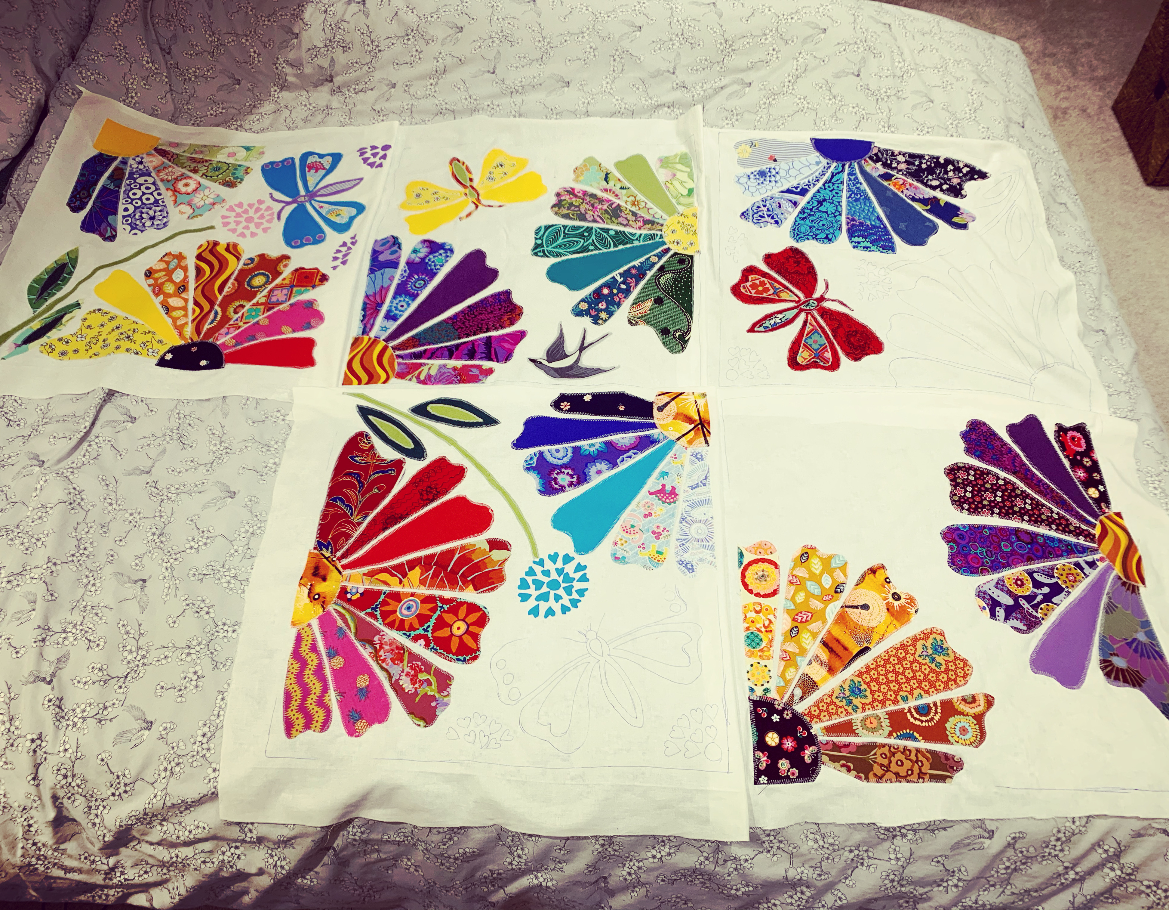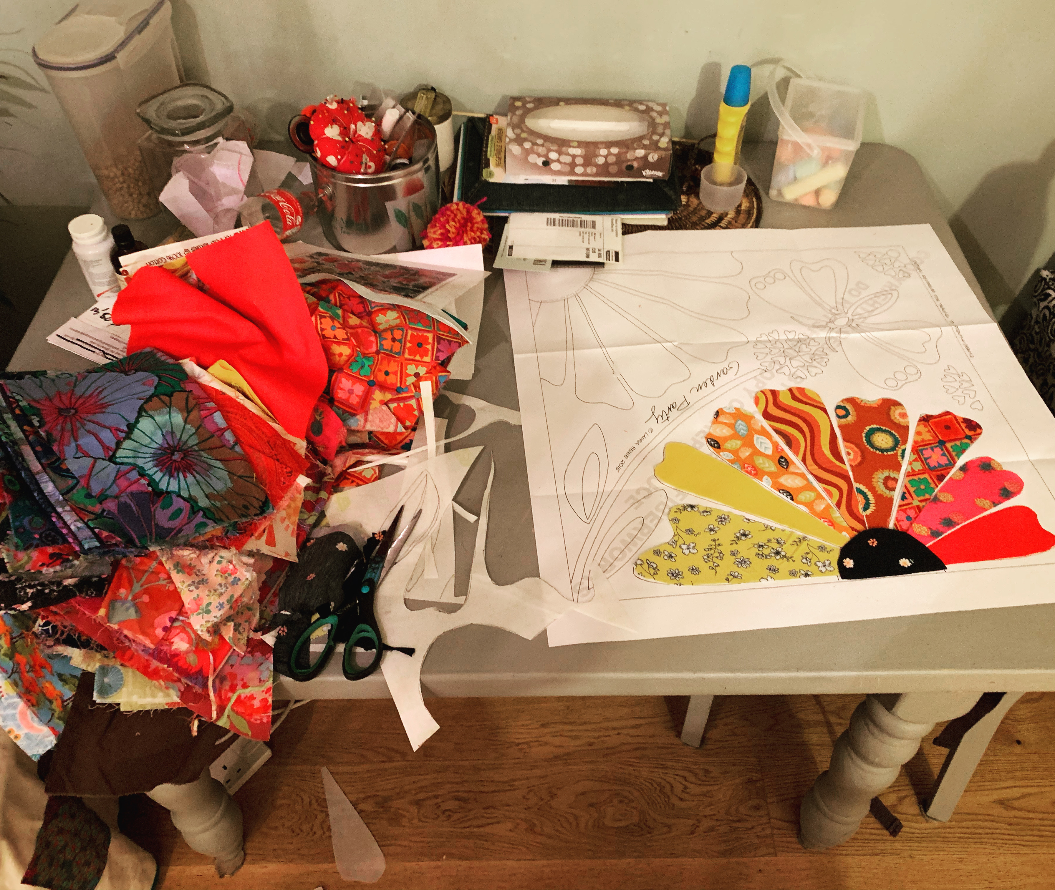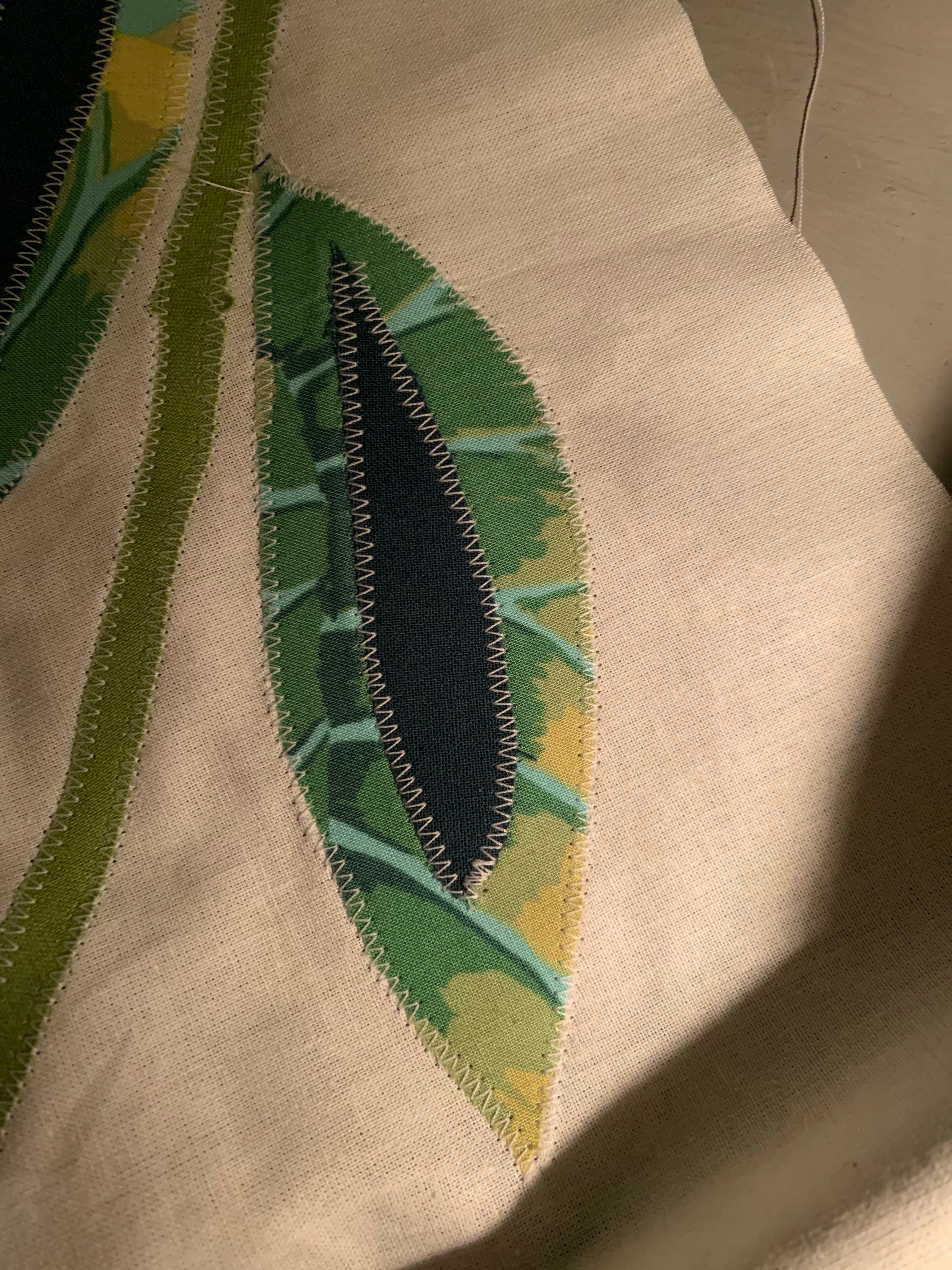 It’s a paper-piecing technique where you cut out the shapes using the template provided (its the same template for every square) and then use double-sided sticky paper (fusible web as it’s often known) to iron it into place on the fabric. Then I sewed around all the edges to hold them in place and stop any fraying.