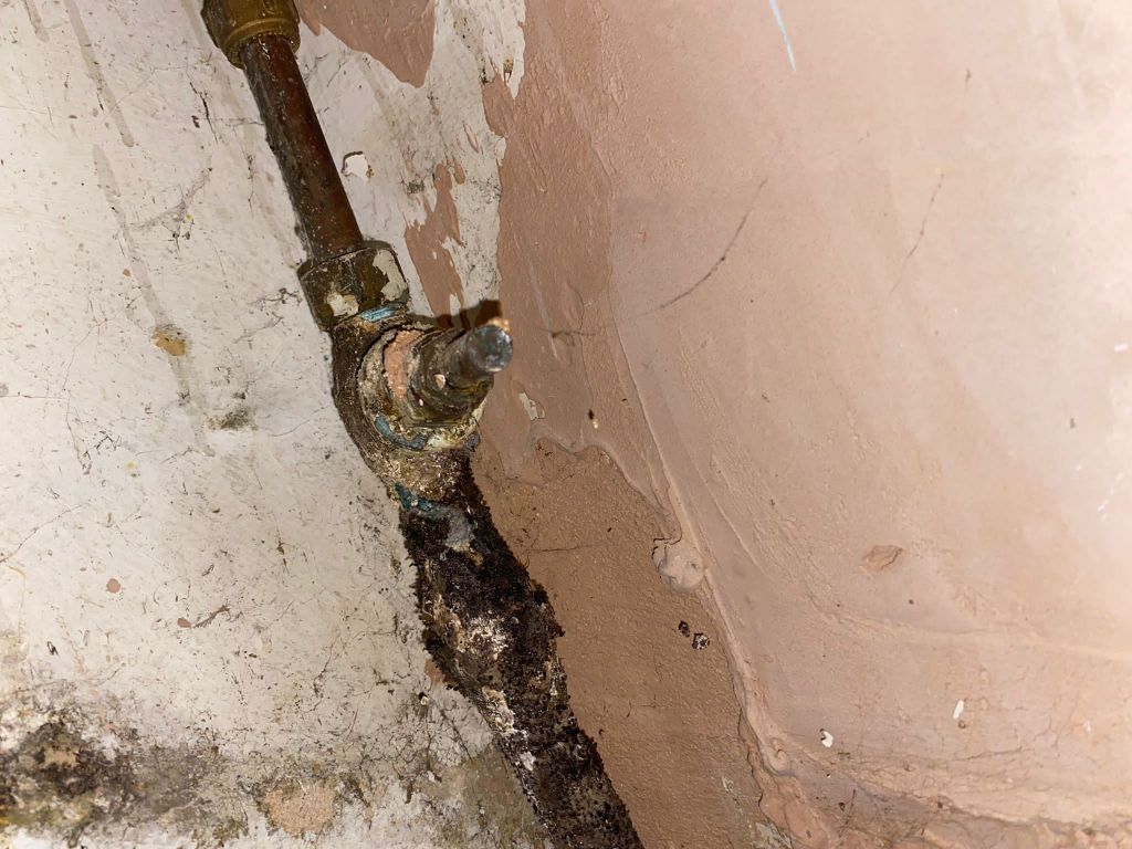 The pipe is badly corroded and doesn’t have a stopcock – it appears to have broken off, so there is no way to turn off the mains water in the case of a leak or burst pipe.