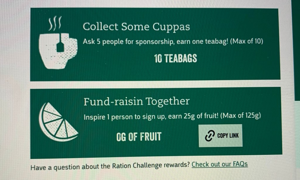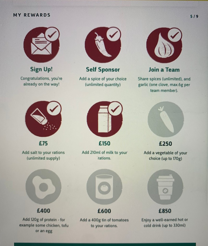 The extras I have earned so far are unlimited salt, and use of up to 6 spices (turmeric, paprika, cumin, etc), one clove of garlic, 10 teabags and 210mls milk. If I raise enough money I can add a vegetable like an onion and also some protein like chicken or an egg. Not only is it a great incentive to encourage people to raise more money but it also aligns with what many refugees do in real life – families share or pool resources in order to stretch their rations further, some might pick up work or earn money to buy treats like vegetables or fruit or teabags to supplement the basic staples.
