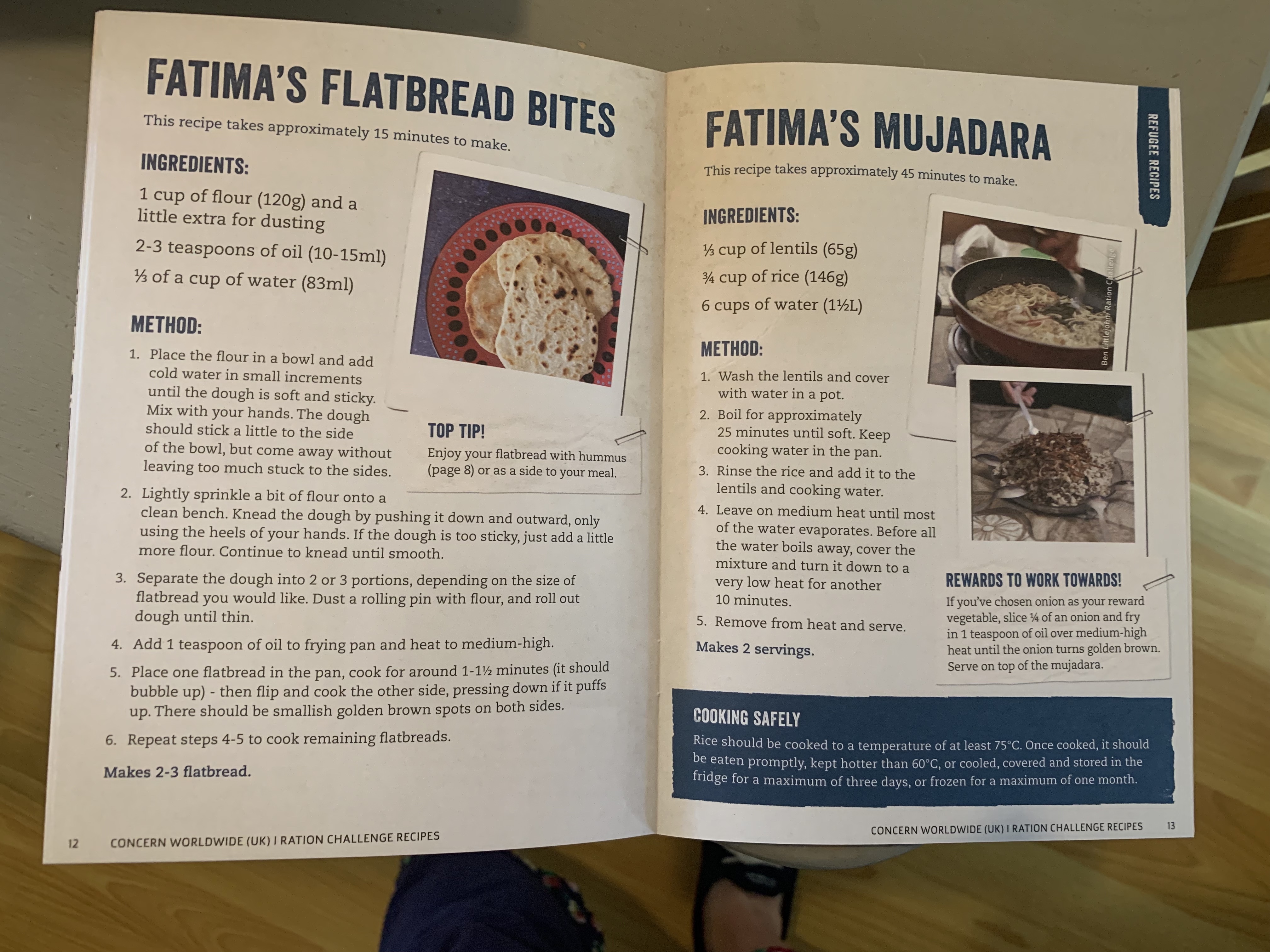 The extras I have earned so far are unlimited salt, and use of up to 6 spices (turmeric, paprika, cumin, etc), one clove of garlic, 10 teabags and 210mls milk. If I raise enough money I can add a vegetable like an onion and also some protein like chicken or an egg. Not only is it a great incentive to encourage people to raise more money but it also aligns with what many refugees do in real life – families share or pool resources in order to stretch their rations further, some might pick up work or earn money to buy treats like vegetables or fruit or teabags to supplement the basic staples.
