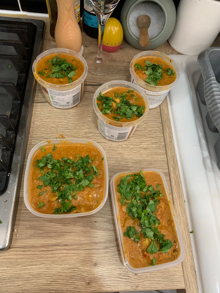 Also this recipe usually makes way more sauce than chicken so in addition to the 8 servings of curry I usually get an additional 4 servings of just sauce which I will freeze so later you can just add in some chicken and have more – so it makes more than 8 servings (about 12 portions altogether) and costs slightly less per portion when you factor the extra sauce into the equation but I have left it simple for now as I just can’t work out the maths of adding in more chicken etc!
